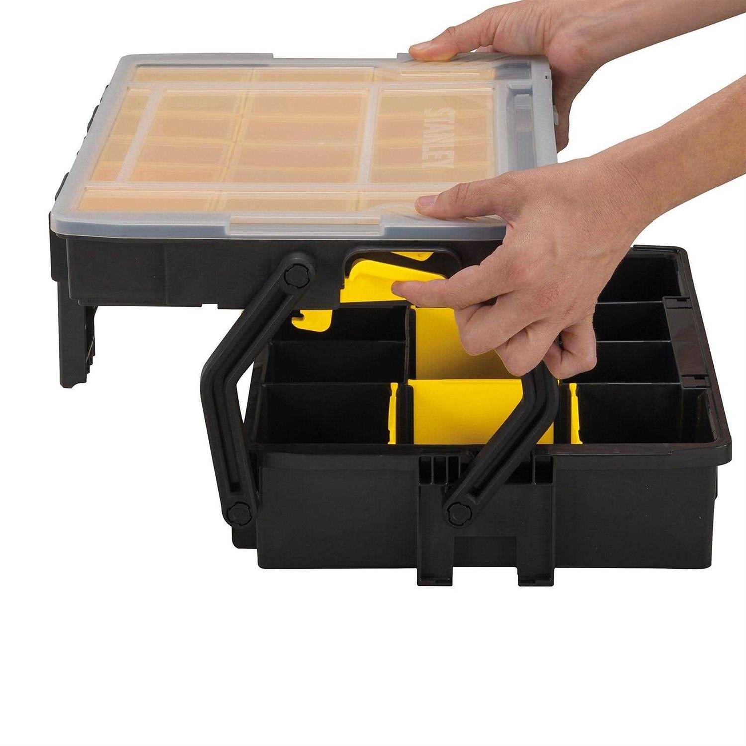 The Stanley Multi-level Organizer is part of the Sortmaster family and combines storage space for small parts or hand tools in a 2-level accessible display. It is fully customizable, allowing it to function both as an organizer and a small tool box, accommodating accessories, small parts or even a small drill. It includes integrated connectivity to either a single or multiple Sortmaster Jr. Organizers (STST14022).