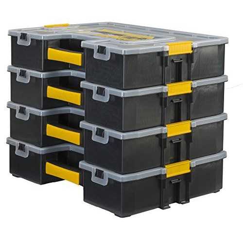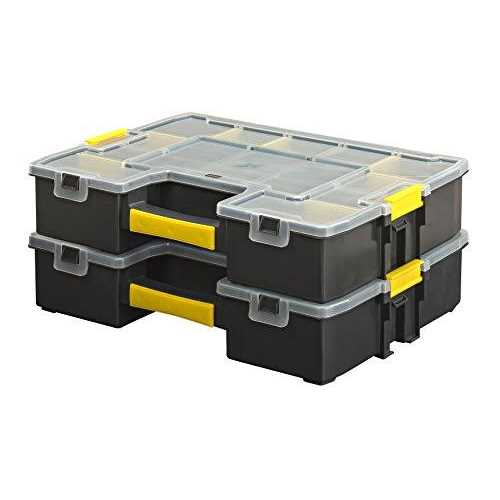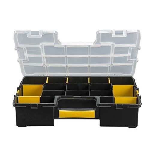 This Stanley 17-Compartment Small Parts Storage Organizer features deep, adjustable compartments that are great for organizing small parts and tools. It has a built-in handle that makes it easy to carry with you. This plastic storage case has 2 locking tabs and a lid lock, so parts stay in place. Plastic construction for durable, rust-resistant small parts organizing. 17 deep, adjustable compartments for versatile storage. Built-in handle for easy carrying. 3 locking mechanisms help prevent spills. Includes additional dividers for convenience.