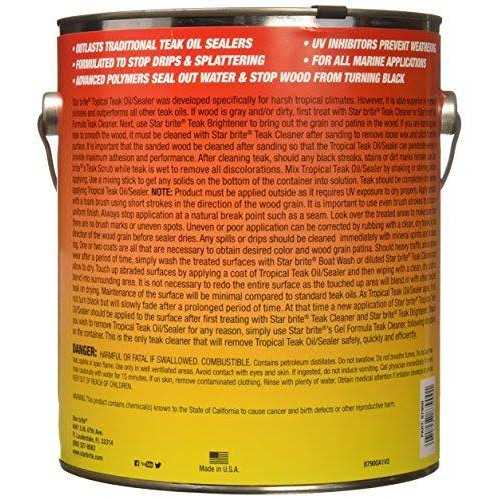 This is a teak sealer that makes teak almost maintenance-free. If the wood is grey and/or dirty, first treat with Star brite Teak Cleaner and Star brite Teak Brightener. Shake Tropical Teak Oil/Sealer well before applying. Use a mixing stick to get any of the solids at the bottom of the container into solution. Teak should be completely dry when applying Tropical Teak Oil/Sealer. Apply product with a foam brush using short strokes in the direction of the wood grain. It is important to use even brush strokes to obtain a uniform finish. Always stop application at a natural breakpoint such as a seam. Look over the treated areas to make sure that there are no brush marks or uneven spots. Uneven or poor application can be corrected by rubbing with a clean dry towel in direction of grain before sealer dries. Any spills or drips should be cleaned immediately with mineral spirits on a clean rag. One coat is all that is necessary to obtain the desired color and wood grain patina.