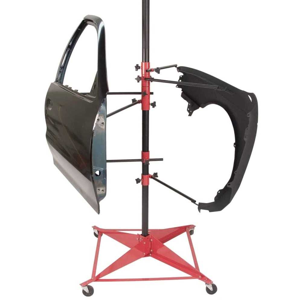 Features and Benefits Panels load easily and quickly Center post design allows access to edge bottom and both sides of the panel Paint panels jambs and car all at one time Caster for easy mobility Hold one or two panels securely Panels load easily and quickly Center post design allows access to edge bottom and both sides of panel. Paint panels jams and car all at one time. Save hours of dry time compared to seperate painting. Holds doors fenders hood trunk lids and more “.