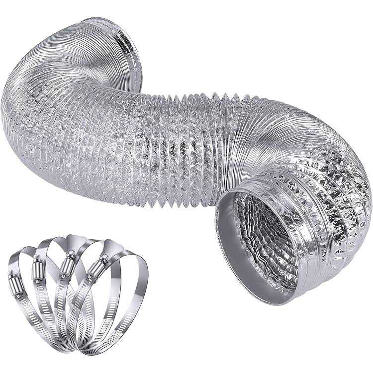 Heavy Duty: Our dryer hose is twice thicker than most 3-ply thin option in the market. It is super strong, hand tear and pet puncture resistant. 35 LBS loading 72 hours test as shown in the video. This is a 4 inch flexible duct, not easily snapped, leaked and punctured by dryer vent cleaning brush! More Heat Resistant: Our aluminum foil dryer vent hose withstands max.215 Fahrenheit degrees high temperature. Compared with black or grey pvc dryer vent hose, it is more aging resistant in hot and moist air condition. The metal material will not melt easily and emit obvious plastic smell. Lower Pressure Drop: Our flexible dryer vent hose is in narrower wire helix & foil accordion design for larger inside diameter. It exhausts air faster. The design also increases the duct strength and decreases shaking and noise. Handy To Use: Our dryer vent hose kit is with 2 types of hose clamps. 2 wing nut type are perfect for tight space quick connect or disconnect as no tool’s needed. You can use the other two 5/16″hex type by a nut driver for fast torquing. If you have both 90 degree elbows, 4 clamps will be perfect. Multi-Purpose: Steelsoft 4 inch duct hose is very handy for many HVAC applications, such as clothes dryer vent pipe hose, bathroom exhaust fan, grow tent air duct and portable ac unit etc. It is a heavy duty flex duct hose for less replacement! p Steelsoft 4 inch flexible duct hose is in flexible structure of narrower wire helix and foil accordion. It is constructed with extra thick aluminum laminate for super tear & puncture resistance. It withstands 35 lb for 72 hours and never snapped according to our test. – br – -Features- – 1. Extra thick for prevent crushing easily and pet scratching. – 2. High heat available to meet safe local building codes. – 3. No plastic smell like PVC type when dryer is running. – 4. Reinforce ends for easy and quick connect. – 5. Widely used for dryer vent tubing, grow tent, portable ac etc. – br – Operating temperature Range: 0°F to 215°F – Recommended Velocity: 5000 FPM – Recommended Operating Pressure: 6” w.g. positive – Diameter: 4 inch – Stretch Length: 5 FT – Hose Clamps: 4 PCS /p