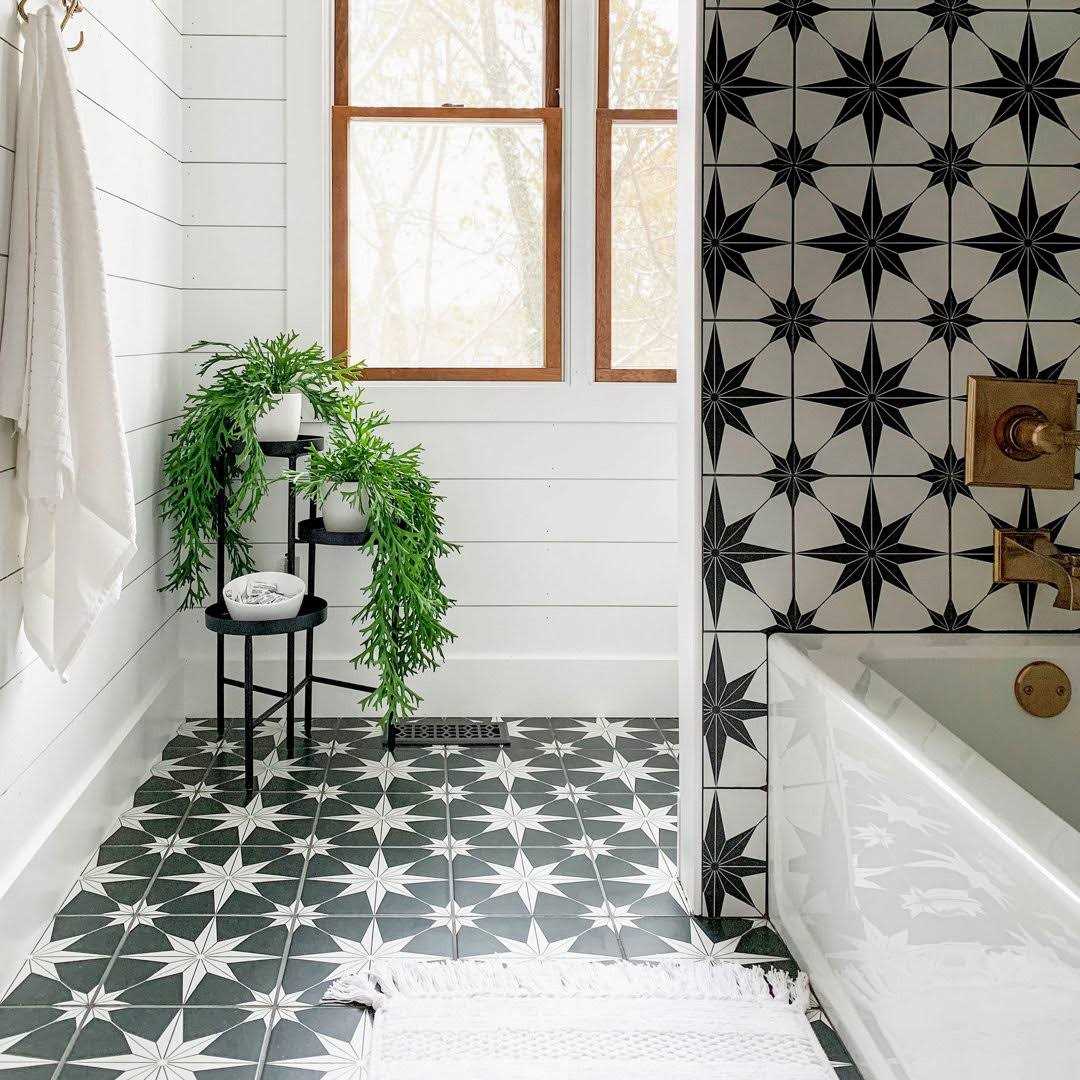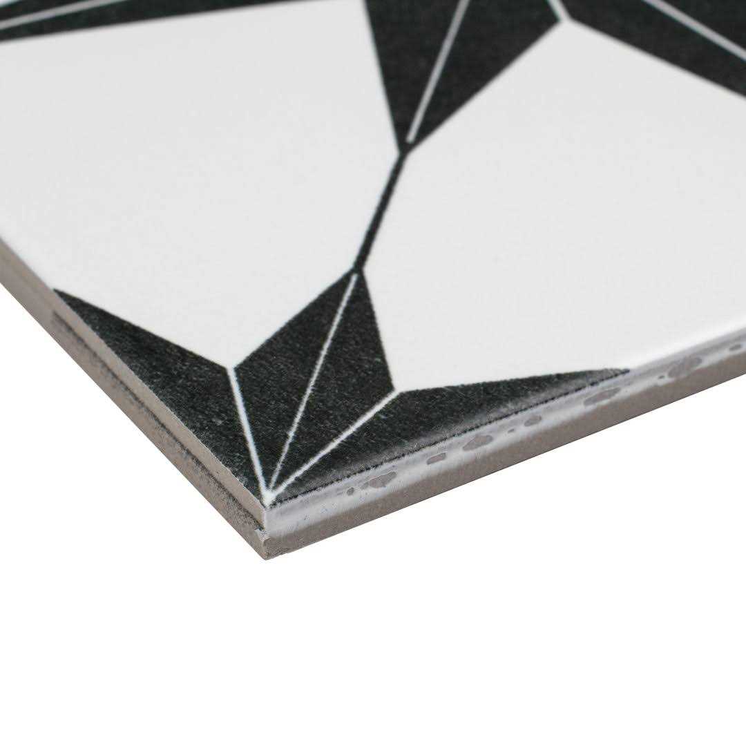 The field tile offers a modern twist to classic old-world European elegance. In muted black and chalky white tones, this unique patterned tile features a star constructed of geometric shapes at its center. The medium-sheen glazed surface offers a sleek look that adds extra character to this unique artistic tile. Its impervious and frost resistant features make this an ideal for both indoor and outdoor use, including backsplashes, bathrooms, and kitchens. This product is the better choice for your space. This tile is made from natural ingredients, making it a healthy choice as it is free from allergens, VOCs, formaldehyde, and PVC.