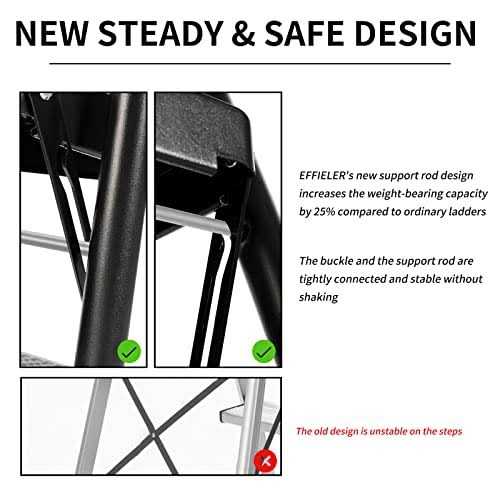 NEW DESIGN LOCK-FREE SUPPORT FRAME:The support rod design of the EFFIELER 2-step ladder is 25% higher than the carrying capacity of the ordinary 2-step stool,The bracket and the main body are tightly connected, stable and without shaking,The folding ladder can be easily folded during storage, which is very convenient ERGONOMIC STEP LADDER:The high-strength steel frame structure is sturdy and reliable, and the 4 non-slip mats have a strong grip,it allows you to easily climb up the 2-Step Steel Step Stool while still providing you with good support and a sense of security 2 STEP LADDER STOOL WIDELY USED:The sponge handle makes the ladder easy to carry. This is your best choice in the kitchen, utility room, and dressing room, Whether it is cleaning cabinets or tidying up closets, you can rest assured to use it, providing you with a higher safety height, If you don’t use a ladder, it can be used as a beautiful plant stand NON-SLIP PROTECTION – The step stool has wide pedals with a non-slip rubber pattern that offers heel-to-toe foot support. Exclusively designed feet are wrapped with patterned rubber, which is more non-slip and protects the floor from injury. Coupled with a soft sponge-covered handle. All designs will bring you a comfortable and stable climbing experience WHAT MAKES THE STEP LADDER STABLE The stability of the folding 2 step stool mainly depends on the thickness of the steel pipe used and the horizontal symmetry of the assembled components during the production process. EFFIELER ladders use 3mm steel pipes and perform balance tests on each ladder produced. User Experience When you are cleaning hard-to-reach areas, Using EFFIELER step ladders at home is your best choice, which will make you easy to use, When folded, the ladder makes it look small and easy to store, Our foldable two-step ladder is an ideal tool for completing any task in various places such as the kitchen, study, bathroom, and garage The ladder can be used in high cabinets to replace light bulbs or clean windows, thereby providing a comfortable working environment and making it easier to complete the work.