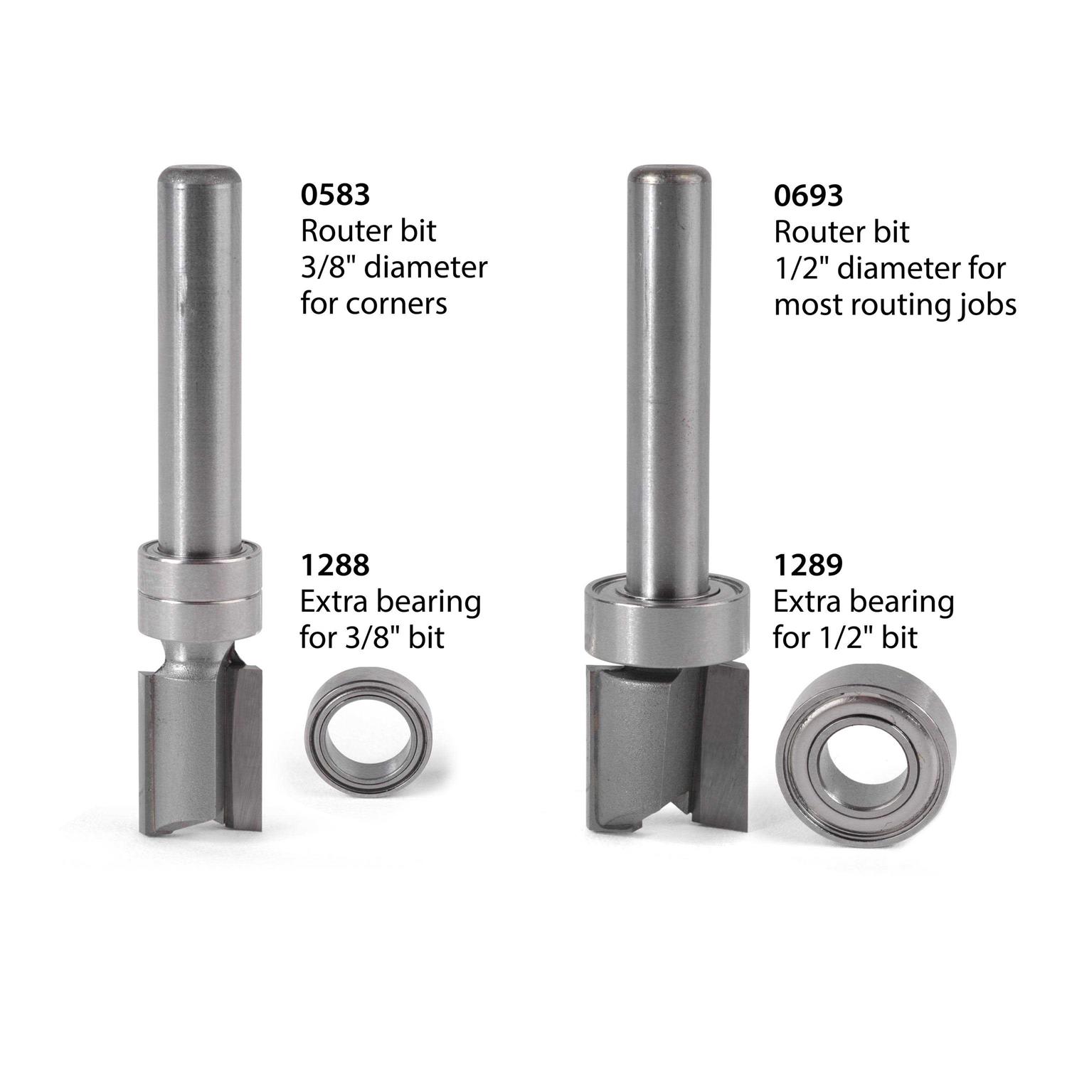 Special bits for templates! Extra-long carbide-tipped router bits produce clean, precise body cavities when used with routing templates. The ball-bearing guide matches the cutting diameter, and the long shank allows multiple-pass routing for deep cavities. The 1/2 inch diameter bit is recommended for most of your routing chores, and comes with 1 bearing. Use the 3/8 inch cutter only for routing corners that need the tighter radius, it comes with 2 bearings. Shank diameter: 1/4 inch (6.35mm) Cutting height: 1/2 inch (12.7mm) A heat-resistant sleeve (not shown) holds the bearing in position. This will greatly extend the life of the bearings and reduces the risk of a bearing “blow-out”.