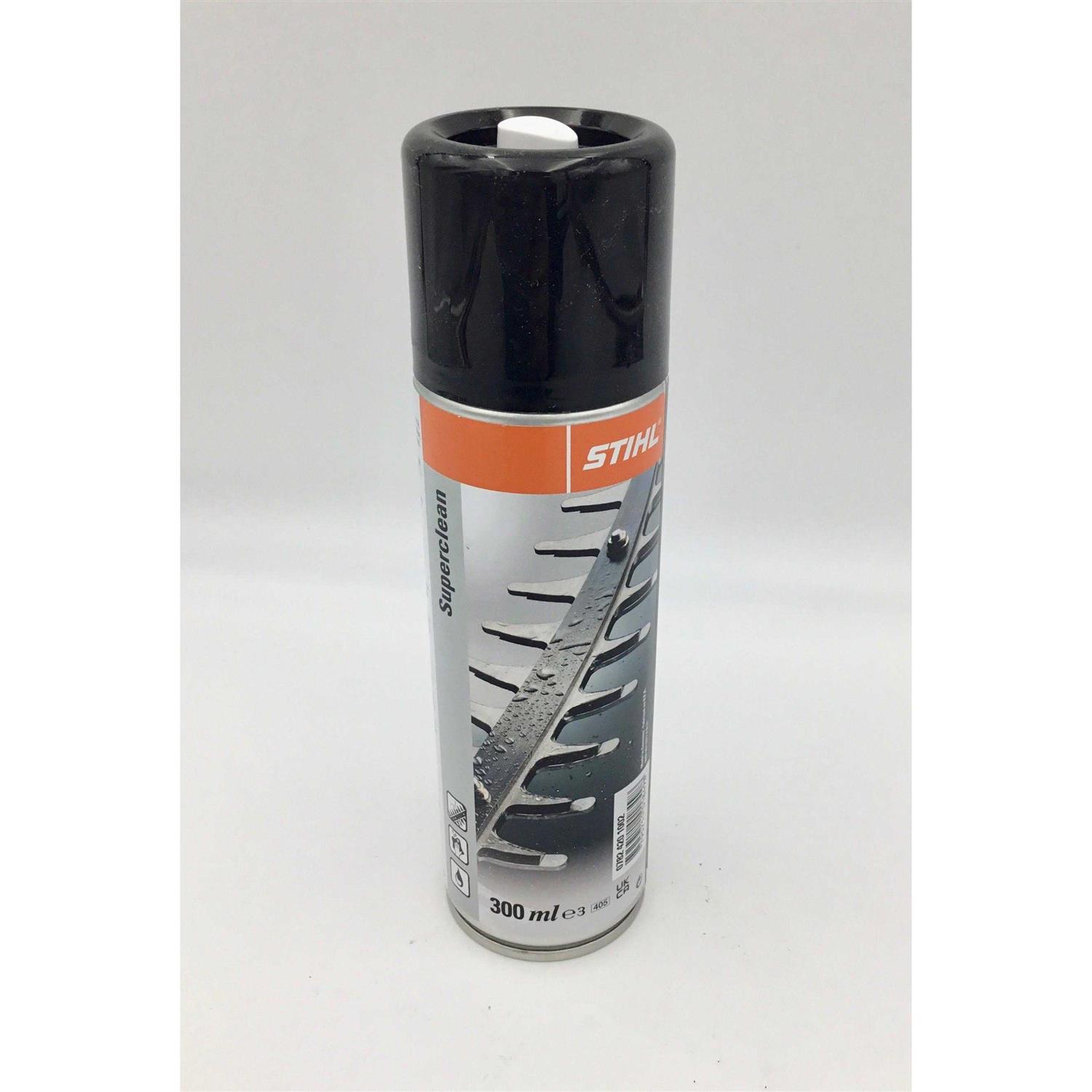 STIHL Superclean for hedge trimmer blades, 300 ml spray can Loosens dirt and lubricates in one. Spray with double function: Loosening of resin and dirt, as well as lubrication and corrosion protection. For cutting sets, hedge trimmer blades and power saws. Application note: Spray the cutting tools after each use. Hedge trimmer blades should be set briefly in motion thereafter.