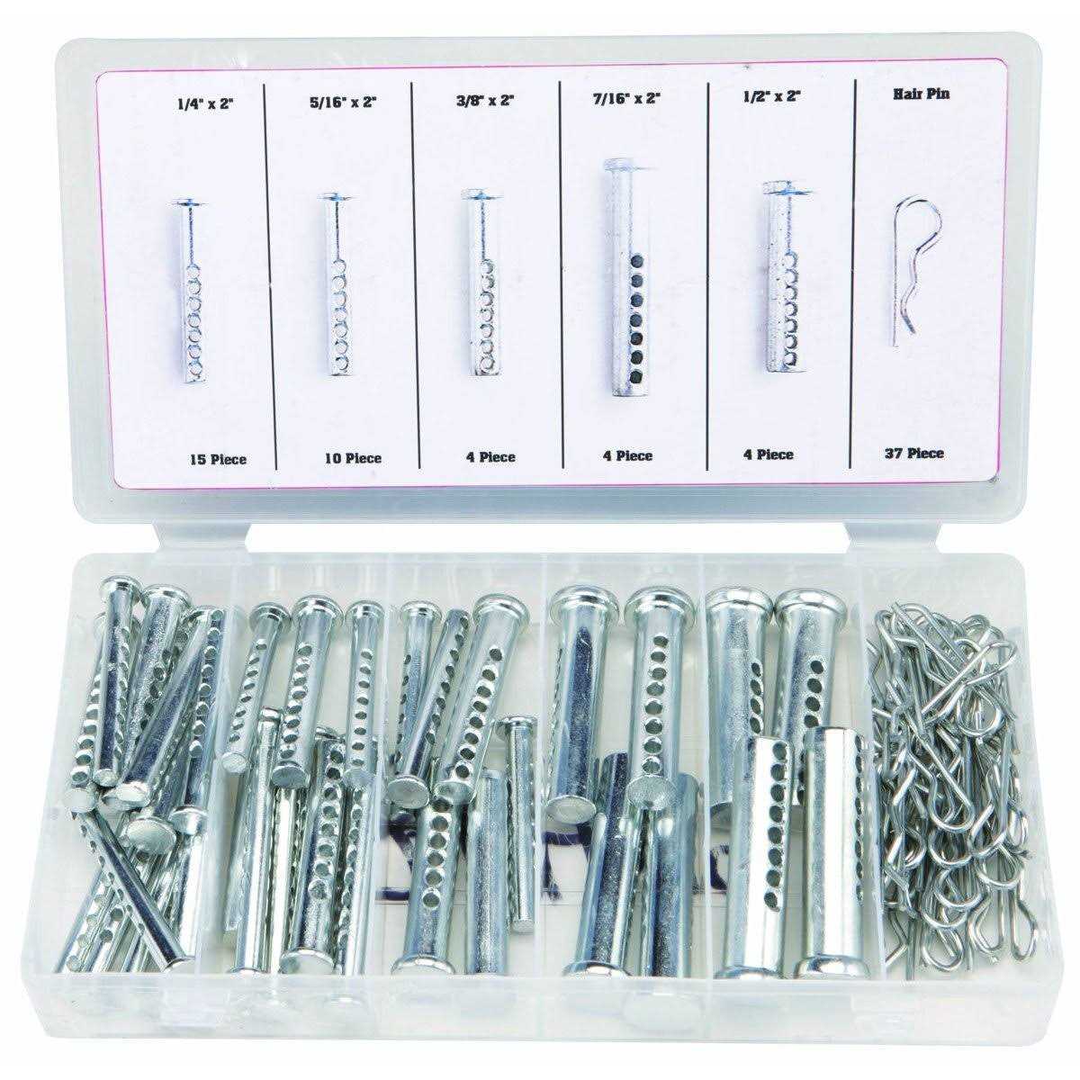 This assortment of clevis pins is ideal for replacing worn retaining bolts or pins in your vehicle or home! The clevis pins set includes 37 assorted pins and 37 matching clips with 8 pin adjustments for a perfect fit. Zinc plated to resist rust, the clevis pins come neatly organized in a convenient plastic storage box.