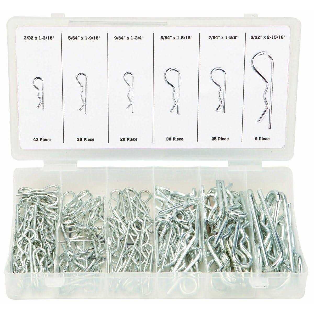 This handy hitch clip assortment is for use on hitches and other frequently assembled and disassembled parts. These quick-release clips are made of durable steel with rust-resistant chrome plating. The hitch clip assortment comes in a lightweight organizer case for easy storage and portability. Handy as a “quick-release” cotter pin substitute Steel with rust resistant chrome plate Handy storage case. StoreHouse Hitch Clip Assortment, 150 Piece in Lantana, Florida 33462.