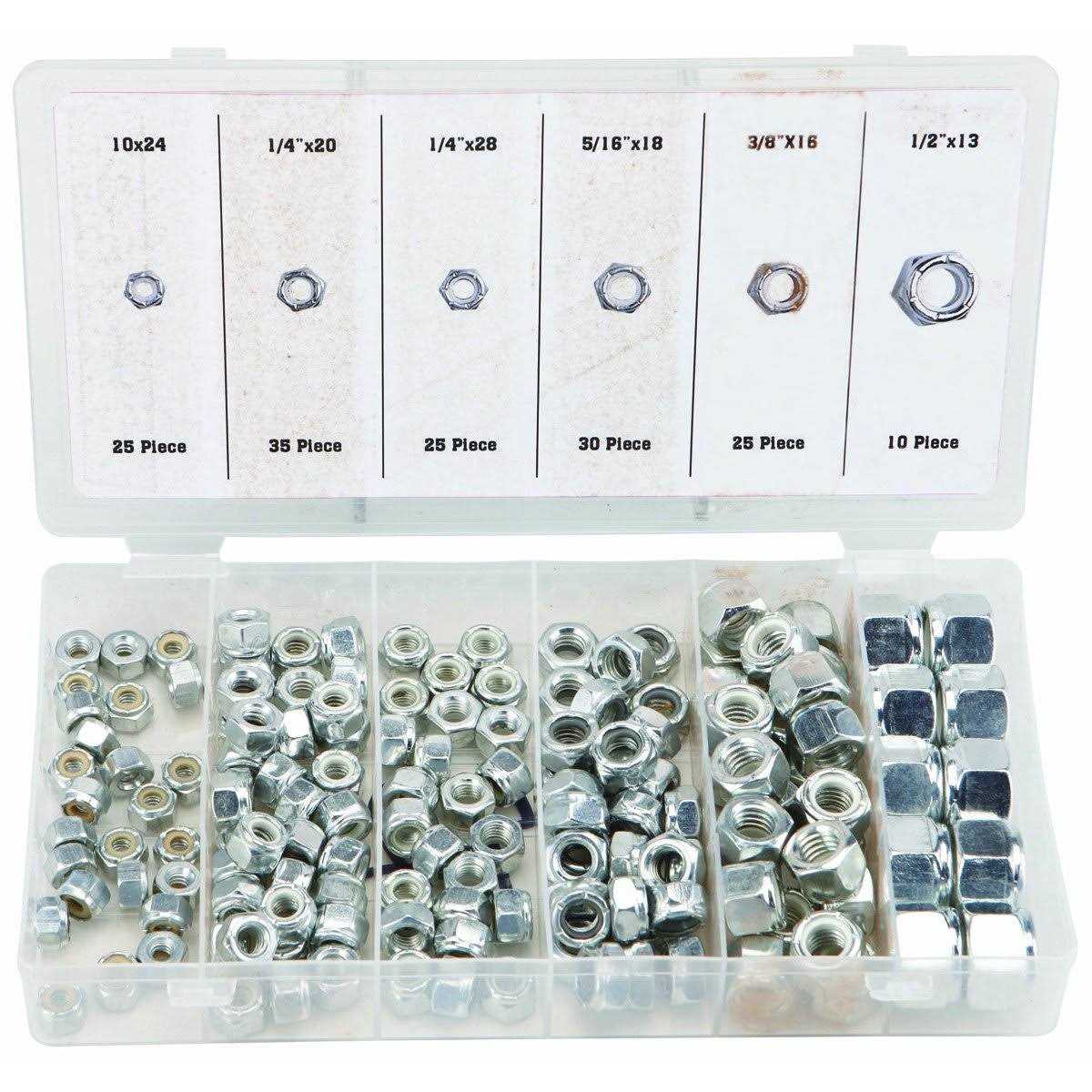 These locknuts stay locked and secure even in the most high vibration applications such as washing machines, dryers and power tools. Each locknut is zinc plated to resist corrosion and includes a durable nylon insert to keep your bolts tight. The locknut set is neatly organized in a divided PVC storage case with an included index chart for easy selection.