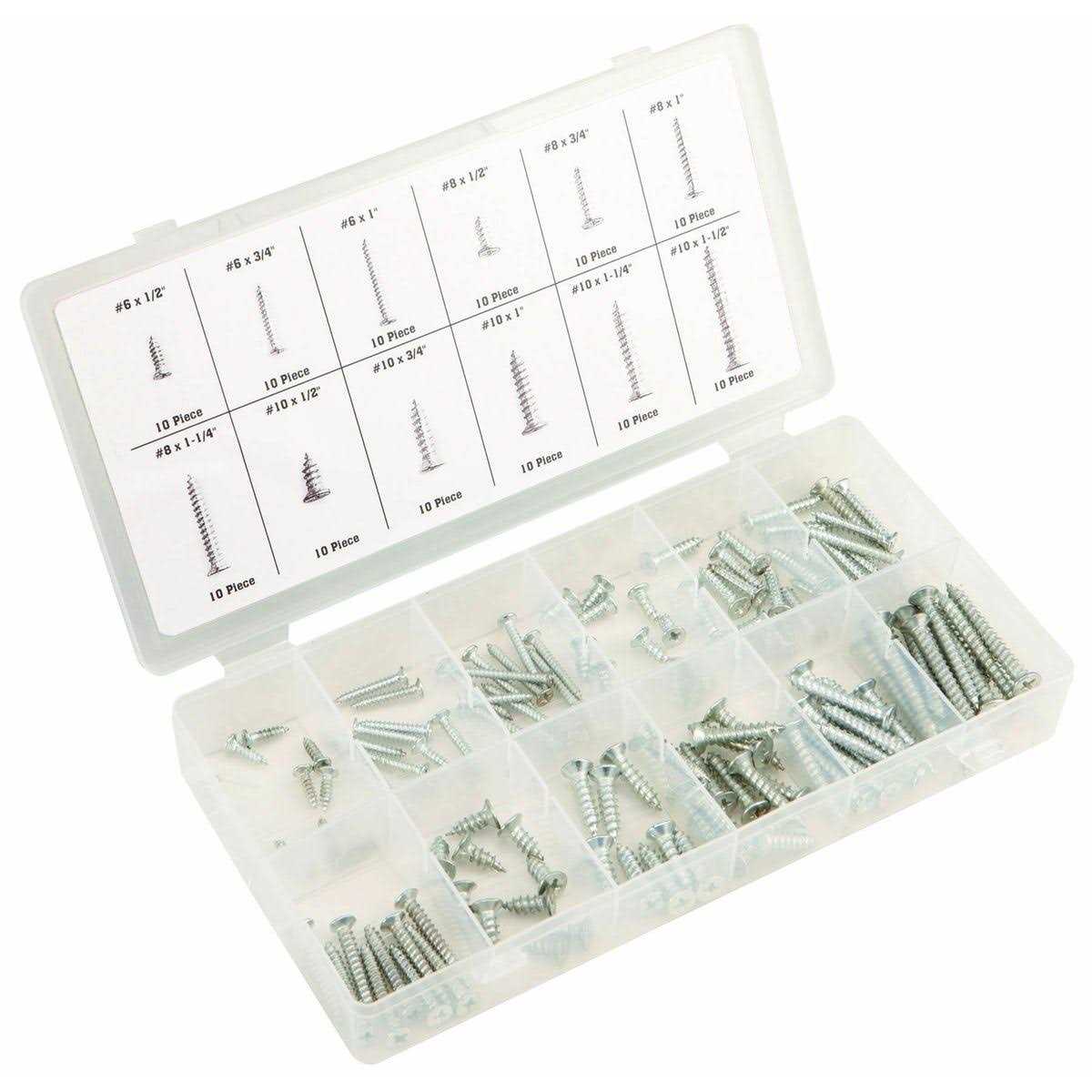 This full selection of self-tapping screws comes organized in a handy clear PVC case, perfect for transportation or storage. The wood screws feature a Phillips flat head and are constructed of zinc plated carbon steel to resist rust and corrosion.
