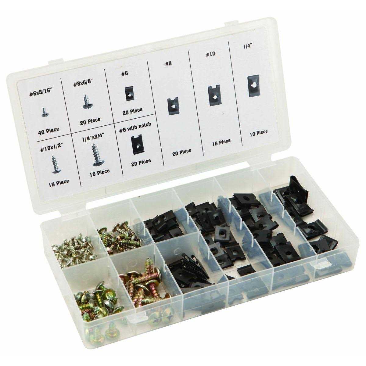 This assortment includes all of the screws and u-clips you need to secure wires and cables! The screws in this set are zinc plated and the u-clips are constructed of black oxide finished spring steel for resilient durability. Neatly organized in a PVC storage case, this handy set of screws and u-clips is easy to take to wherever they’re needed!