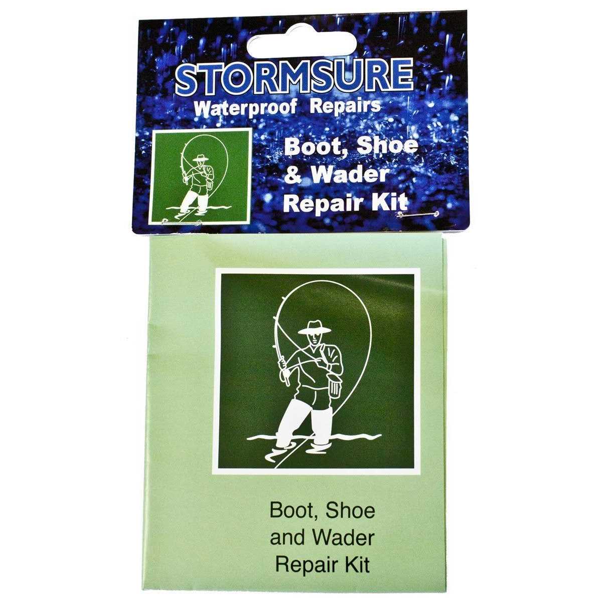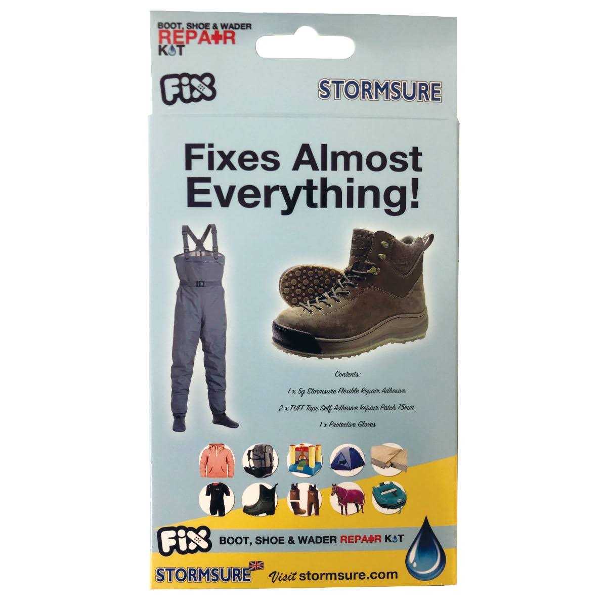 Fixing damage to boots, shoes and waders. Stormsure’s repair kits are all-in-one packs containing carefully selected contents that enable you to easily make reliable and long-lasting repairs to the respective type of item or piece of equipment. DIRECTIONS For instant repairs to punctures and splits on generally flat surfaces, clean the surface and apply a TUFF Tape patch or strip directly onto the damage. Rub with a smooth, hard object to ensure best adhesion and least air under the patch. For damage in awkward or hard to reach areas, clean the damaged are (sand for best results) and apply Stormsure Flexible Repair Adhesive directly onto the damage, leaving a 5mm excess overlapping around it. Leave flat and allow to cure for 10-12 hours. TIPS Mix with Stormcure Accelerator to reduce cure time to approximately 1 hour. Ensure there is no air left in the tube before replacing cap. Store partly used tubes in a freezer.