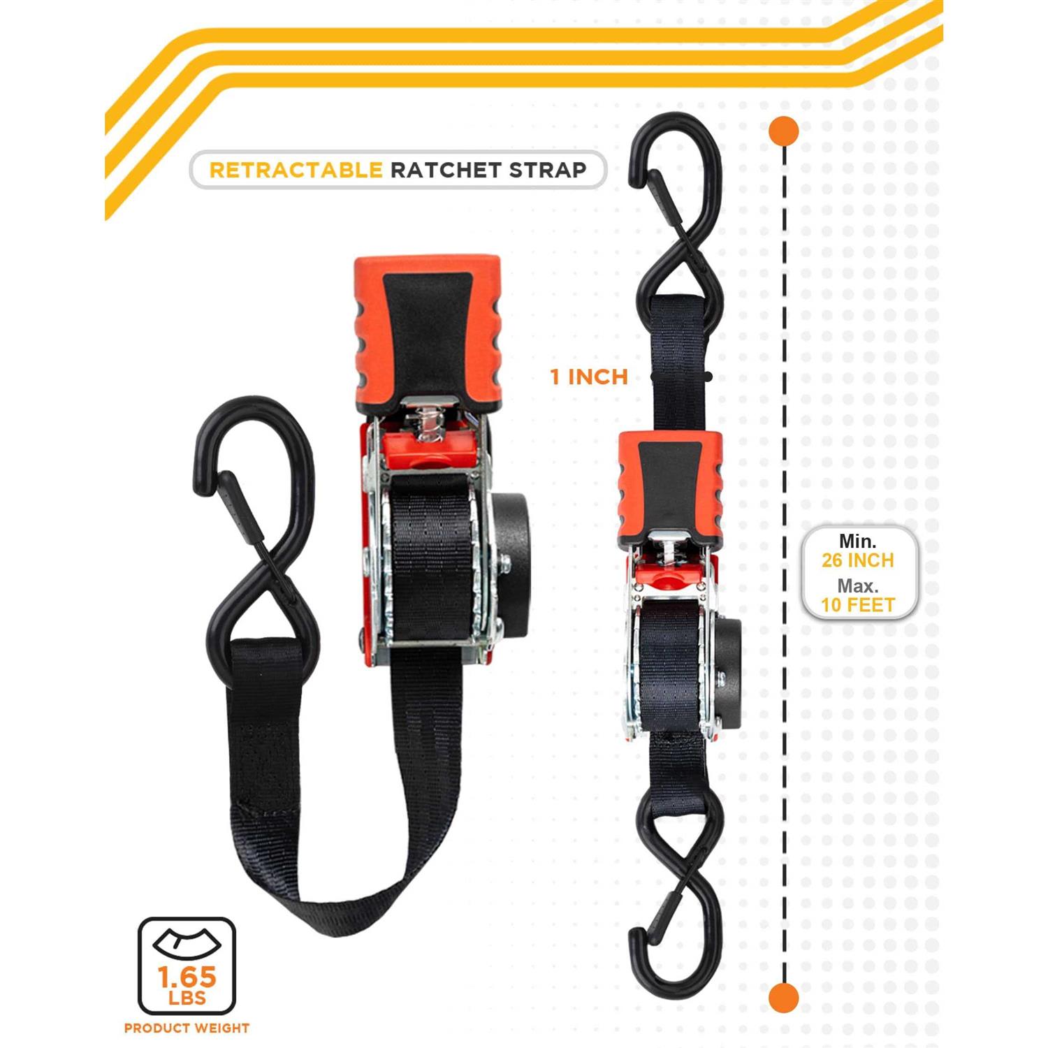 Strapinno Retractable Ratchet Straps 1 in x 10 ft Secure Tie-Downs with Rubber-Coated Steel Handles S-Hooks & Durable Hardware for Motorcycle Jets