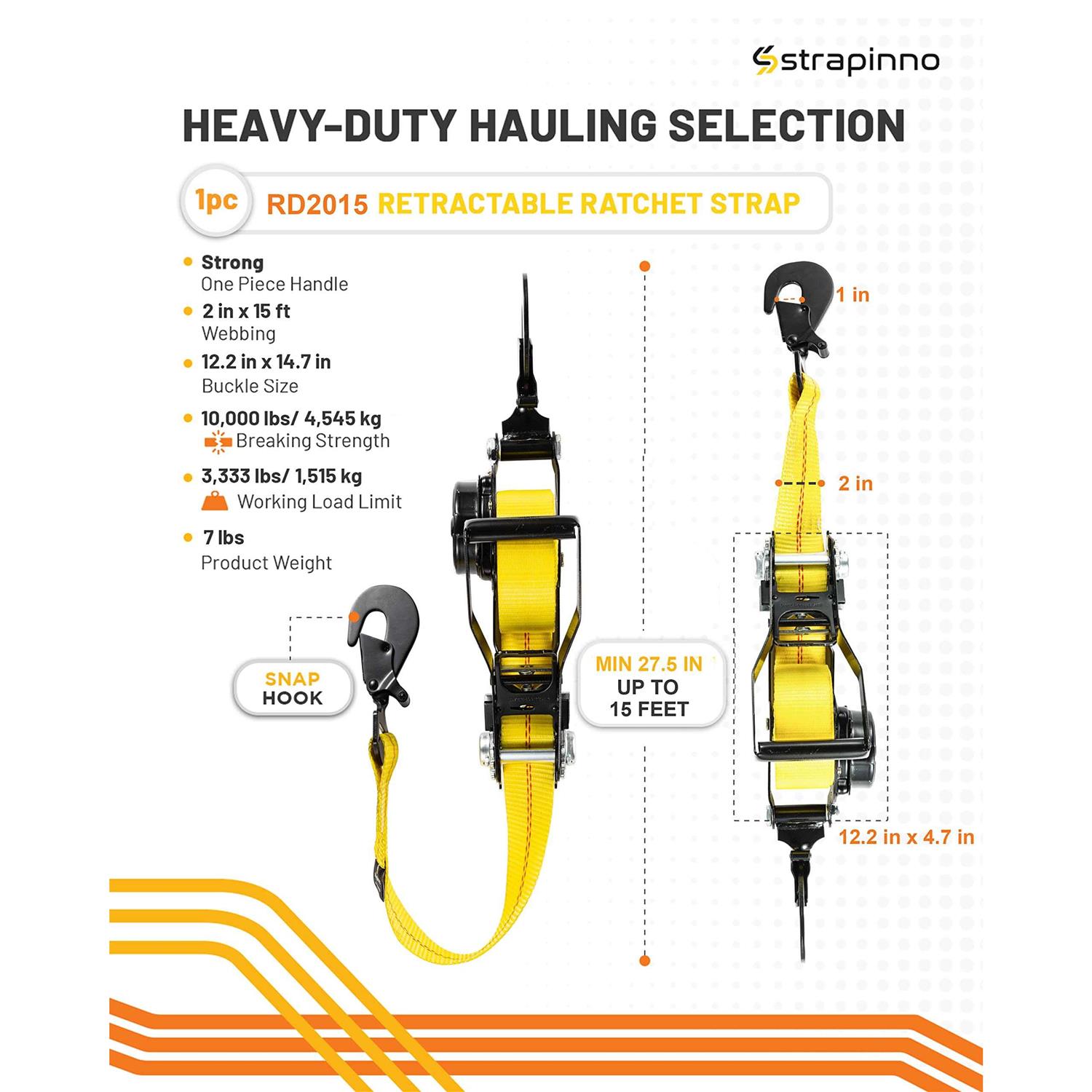 Strapinno Retractable Ratchet Tie-Down Strap,2in x 15ft Heavy-Duty Strap with Snap Hooks,10,000lbs Breaking Strength & 3,333lbs Working Load Limit,