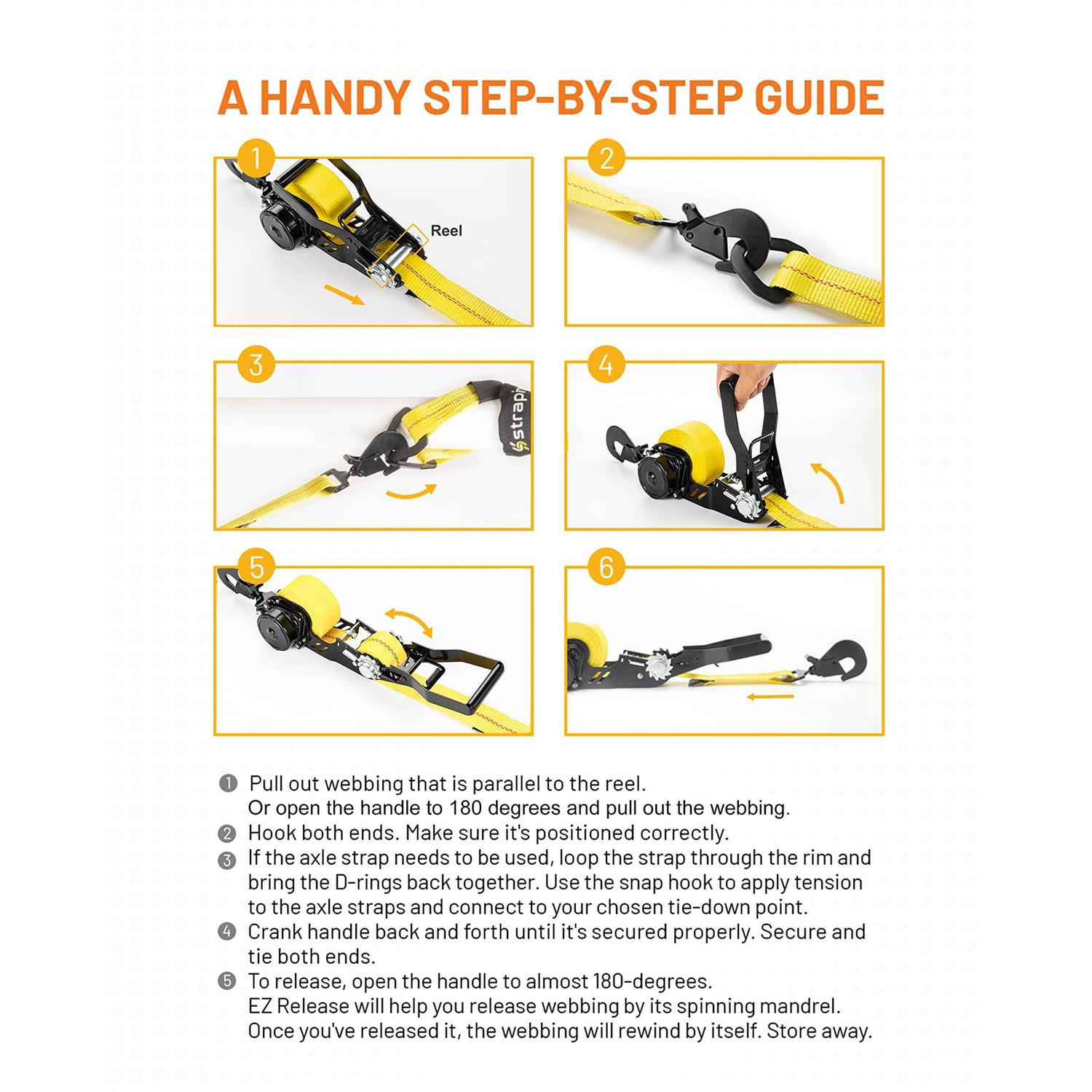 Safely Strap Up. Keep your vehicle and cargo safe in transportation. Our retractable ratchet strap enables you to tie down and release fast, easy, and securely. It’s also reusable for hauling. Use It Anytime, Anywhere. Have peace of mind and say goodbye to excess webbing. Even with our wider and larger straps, the webbing releases effortlessly. You can easily store it away too. Tangle-Free Release. With 10,000lbs breaking strength and 3,333lbs load capacity, our strap releases and rolls back up easily. It comes with an axle strap for securing around the axle or rim. Haul with Ease and Confidence. Strapping has never been easier. Simply pull out the webbing. Hook both ends. Crank the handle and release. After a few uses, you’d be confident to haul away! Premium Quality. Our retractable strap is made from 2 in. wide durable polyester webbing and a strong steel handle. Its ratchet buckle is guaranteed rust-resistant with the salt spray test. Standout Straps For Everyone Ratchet straps have been around for a while. Historically used in the transportation industry, it has evolved to be a must-have in every household. With STRAPINNO’s retractable ratchet strap, you don’t have to worry about spooling, dealing with extra length, and loose webbing. It also comes with an axle strap for protection while you tie it down by the axle or through the car’s rim. You can be confident to use our ratchet straps without hesitation when hauling your belongings. Securely tie down your dirtbike, ATV, jetski, boat, equipment, and other cargo via trailers or pickups. Drive with confidence with our heavy-duty ratchet straps and never worry about loose webbing again. How to Use Retractable Ratchet Strap 1. Pull out webbing that is parallel to the reel. 2. Hook both ends. Make sure it’s positioned correctly. 3. If the axle strap needs to be used, loop the strap through the rim and bring the D-rings back together. Use the snap hook to apply tension to the axle straps and connect to your chosen tie-down point. 4. Crank handle back and forth until it’s secured properly. Secure and tie both ends. 5. EZ Release will help you release webbing by its spinning mandrel. No tangled webbing guaranteed! 6. Once you’ve released it, the webbing will rewind by itself. Store away. Product Details In The Package Note: Use a proper ratchet strap according to your car type or cargo. Kindly use it within the capacity load. → 1pc.RD2016 Strong one-piece steel handle Includes 1 axle strap with delta ring + protective sleeve 2 in. wide x 16 ft. long webbing Snap hook on both ends 10,000lbs (4,545kg) Breaking Strength 3,333lbs (1,515kg) Working Load Limit Buckle Size: 12.2 x 4.7 inches