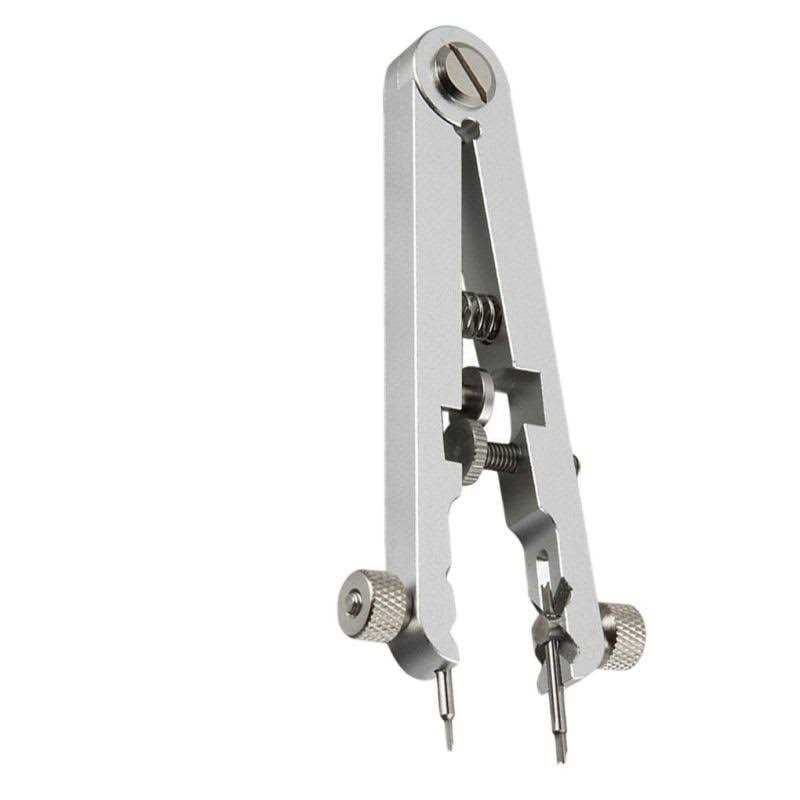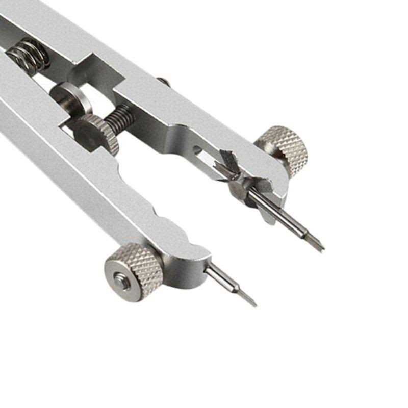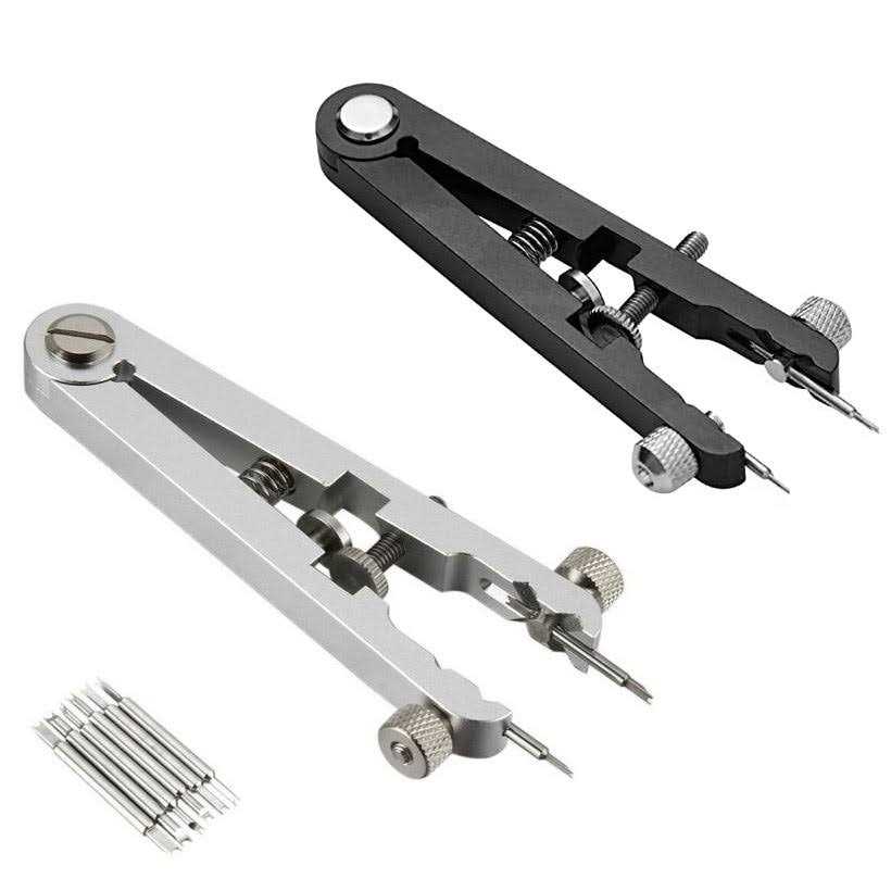 This tool will allow you to easily grip and compress both spring bars at once in order to easily remove tough to take off metal watch bracelets. This can be particularly useful when dealing with curved end bracelets and tight spaces. This tool is adjustable in width (up to 30mm) and features 8 removable pin forks in a range of sizes to suit all sizes of spring bars.