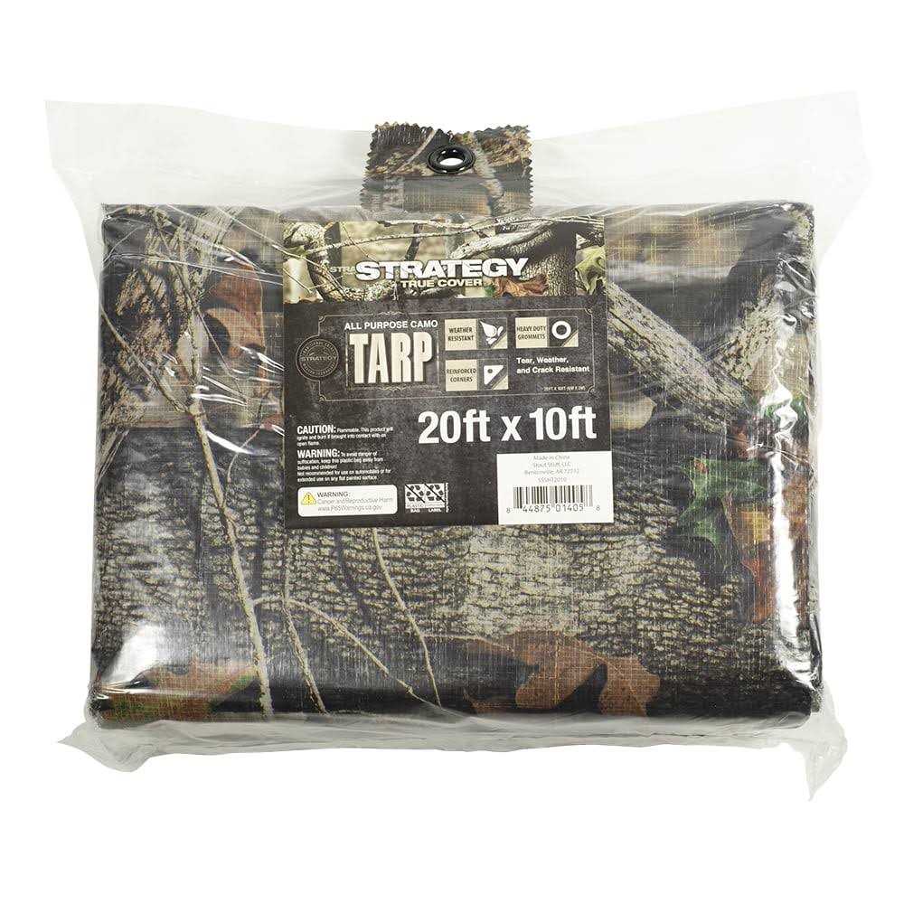 The Strategy True Cover All Purpose Camo Tarp is a tarp you will want to pack whenever you are going hunting, fishing or just spending time outdoors. This all purpose tarp is made of durable polyethylene that is tear, weather and crack resistant featuring a unique Strategy Camo pattern . The Strategy Tarp has reinforced corners that feature heavy duty grommets making securing this tarp down easy for you. This 20 foot by 10 foot Strategy all purpose tarps can be used for wide variety of uses including temporary pickup truck bed covers, drop sheet or protective layer for tents, cars, boats, fire wood and more! The Strategy all purpose camo tarps are available in multiple sizes with one that are sure to me your demands.