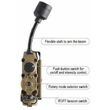 Designed to minimize the number of illuminators and beacons an operator must carry, the low-profile Sidewinder Stalk provides ultimate maneuverability. Put light where you need it with multiple mounting options and a flexible stalk to aim the beam. Multi-fuel capability allows it to accept more than one battery type. Features visible white, multi-colored and IR LEDs. A separate Identification Friend or Foe (IFF) switch lets you use both the main light and IFF when needed.