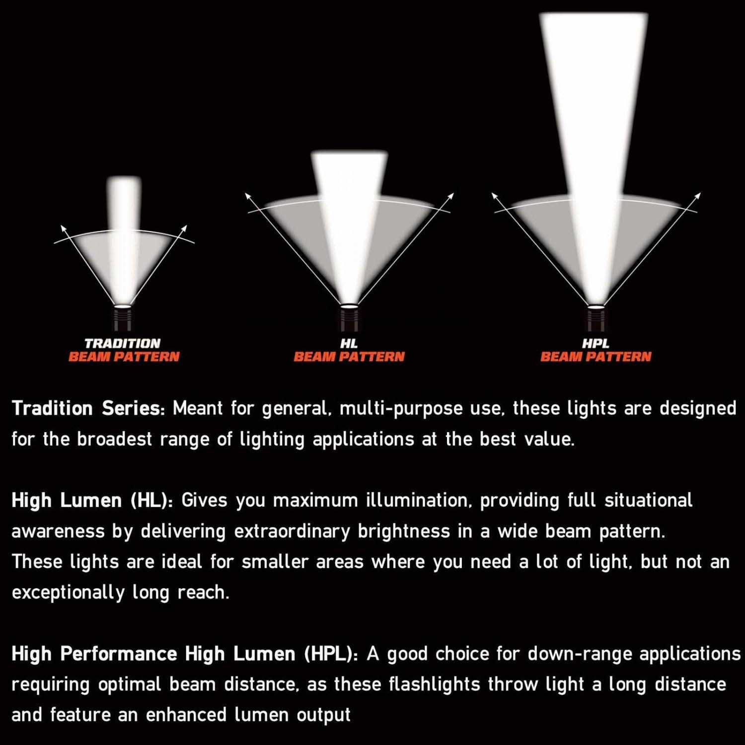 - Low for a less intense beam and extended run time: 40 lumens; 800 candela; 57m beam distance; runs 20 hours.