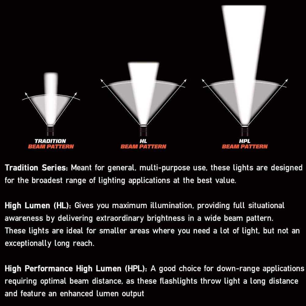 DUALSWITCH TECHNOLOGY Access multiple lighting modes via the push-button tail switch or head-mounted switch. Switches operate independently. TEN-TAP programmable switch allows user to select one of three different programs: 1.) high/medium/low with strobe (factory default); 2.) high only without strobe; 3.) high/medium/low without strobe Three modes and strobe: High for a super-bright beam: 700 lumens; 12,000 candela; 219m beam distance; runs 1.25 hours Medium for bright light and longer run time: 300 lumens; 5,000 candela; 141m beam distance; runs 3.25 hours Low for a less intense beam and extended run time: 40 lumens; 800 candela; 57m beam distance; runs 20 hours Strobe for disorienting or signaling your location: runs 2.5 hours