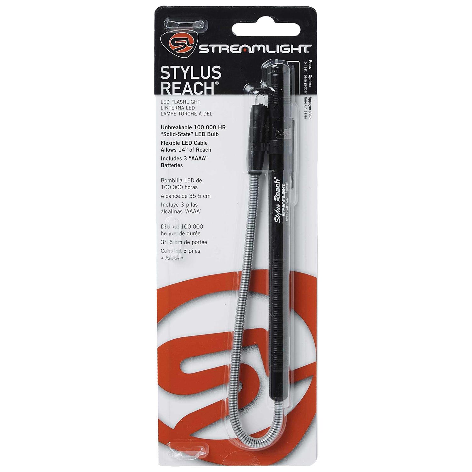 The Stylus Reach 18 is machined from an aluminum case with non-slip knurled grip and flexible cable insulated with PVC. It features a high-intensity white LED build, momentary blink switch and constant “on” and pocket clip. The flexible cable twist and turns into any position to help light the most out-of-the-way places and adds 7″ of reach. Includes batteries and pocket clip.