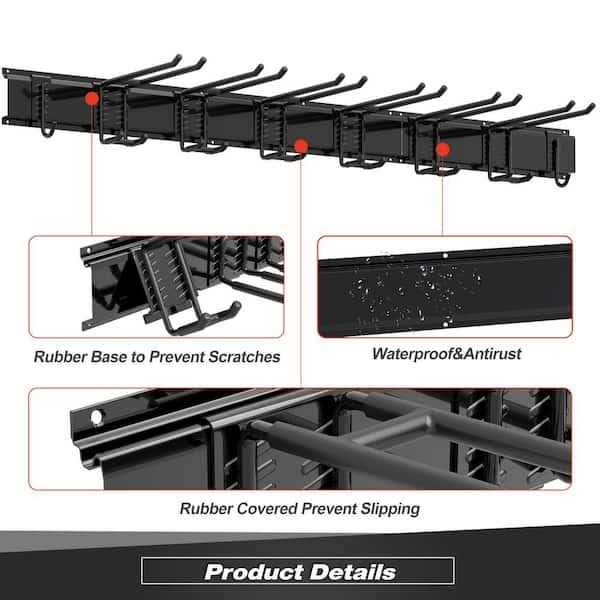 Made with high-strength steel with powder-coated, this garage storage organizer can support up to 450 lbs., making it perfect for heavy tools and equipment. The hooks are rubber-coated (protect your tools from slid and damage) and removable. It includes 2 types of screws for different wall types: self-tapping screws and expansion tubes for brick walls, self-tapping screws for wood walls, and wall anchors for gypsum board walls. Plus, the system is easily expandable, so you can add more hooks or even additional storage components as your needs change over time. Color: Black.