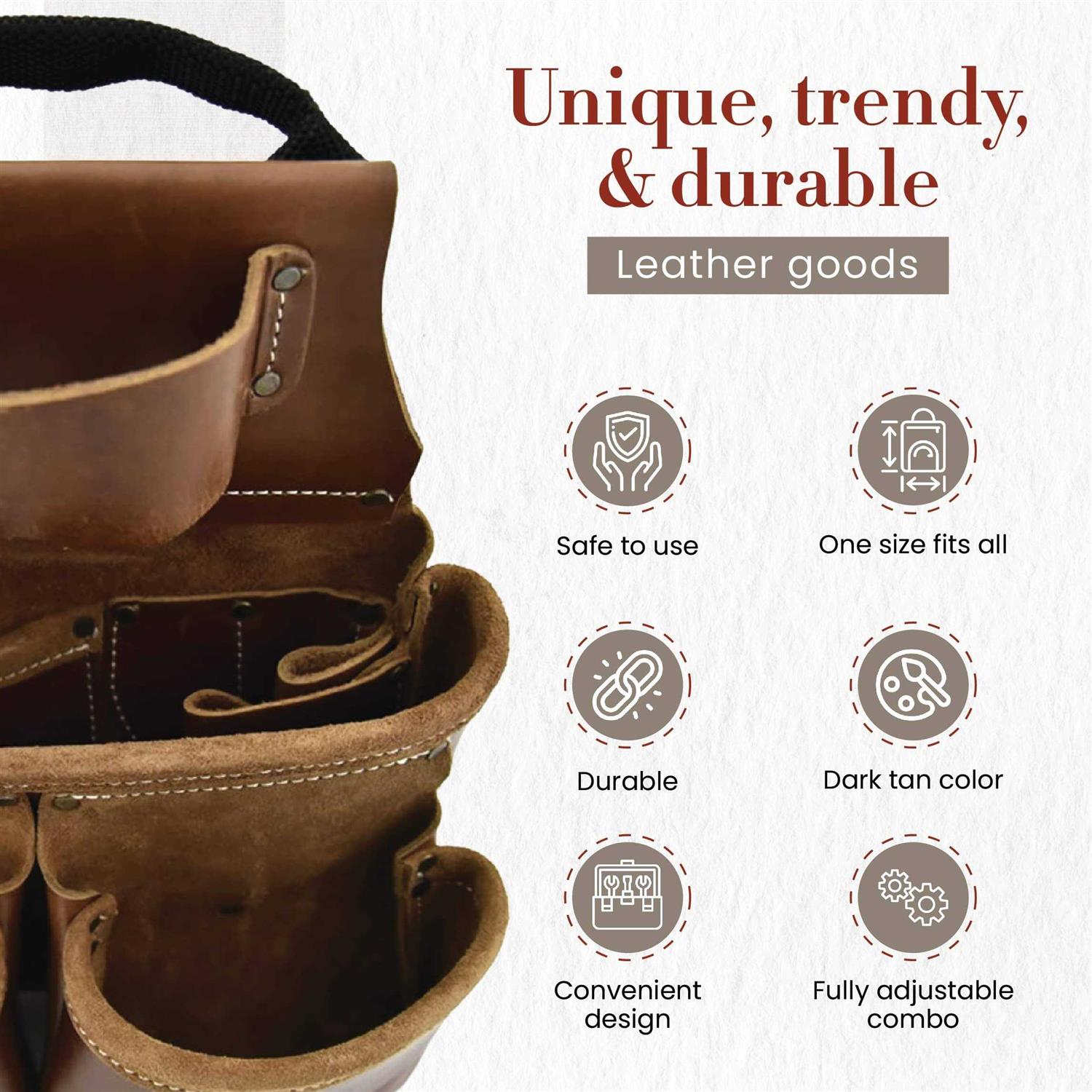 Style n Craft’s 4 piece pro framers combo for right handed Versatile double pouch design with 17 pockets Heavy duty top grain leather in dark tan color Fits waist size 34- 46(measure waist size over clothes for correct belt size) 3 wide taperedheavy leather belt with double prong metal roller buckle 6 internal pockets in the right side main pouch below the tape holder for holding smaller tools like nail sets, pencils, knife, etc. A convenient combination for all workers that includes a tool belt with two extremely beneficial and spacious pouches and a dedicated hammer holder, this tool belt is constructed with full grain leather and heavy-duty nylon thread stitching that withstands every rugged and harsh situation. You can easily keep your tools in these two spacious pouches with 17 pockets, including six internal pockets and a dedicated slot for a combination square between the main and front pockets of the left side pouch. The tape holder on the right-side pouch fits a tape measure with dimensions up to 3-1/2 inch W (left to right) x 2 inch D (thickness). Our tool pouch’s discrete and unique construction provides convenience and enhances tool accessibility. Available in dark tan color with a unique antique finish, this durable leather tool belt can easily fit a waist measuring 34 inch – 46 inch(waist size to be measured over the clothes). Also, the belt is 3 inch wide, tapered with a double prong metal roller buckle, and has rivets with caps for more safety. Our rugged tool pouch features an easy-carry handle on both pouches. The pockets can carry all kinds of tools and are perfect for all professional framers, DIY workers, carpenters, and more! Now, with this combo, you can focus on the job rather than finding your tools!