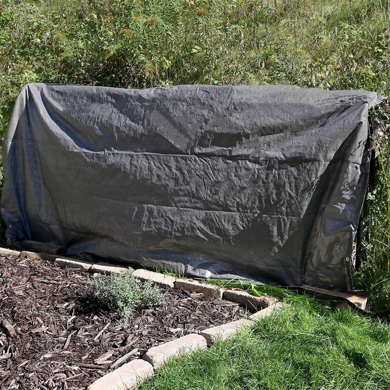 Ensure belongings stay dry and clean outdoors with this water-resistant, multi-purpose poly tarp. Use it to cover firewood or outdoor equipment, as a base floor in a tent during camping or to cover a trailer. This large, heavy-duty poly outdoor tarp is made from durable, rip-stopping polyethylene that is laminated on both sides for maximum strength and long-lasting use. Use this tarp for flatbeds, boats, trailers, lumber, hay, and more. Take it with you on camping or backpacking trips to place over a variety of items in case of rain or snow to keep them from getting wet or dirty. This tarp can even be used to get shelter from the rain. The tarp features weather-resistant and rust-resistant grommets every 2 feet so you can easily secure this tarp to a truck bed, on the ground. This reversible tarp features a neutral dark gray color. Both sides are coated for long-lasting durability and resistance to the elements.