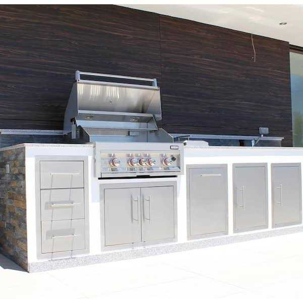 Double Door compliments most BBQ grill sizes between 28 in. to 33 in. and because of its unique versability, it works well with your cleanup or serving zones. The open-door design allows up-to 120° opening as to protect the door panel against dinging on the exterior island finish. The Double Door is sized to perfectly blend with all other Texan Series with matching Height for a Designer Appeal. The Product Size is 30 in. W x 20-1/2 in. H x 1-3/4 in. D and the Cut-Out is 28-1/8 in. W x 19 in. H. The Door is great for easy access for any gas-lines running to the grill and giving clear access for extra storage with clear access. With the double 304-Stainless Steel Rod Handles you have the most stylish BBQ Component and most durable for years to come. Constructed with all 304 stainless steel frame, paneling, and galvanized enclosed drawer box which is protected and safe from the weather. The double door unit is designed to blend perfectly with most other industry Brands, BBQ grills and components with its even toned #4 horizontal light brushed finishes and all large stainless steel rod handles. Texan Series are built with care and craftsmanship from your friends at Sunstone Metal Products LLC., a Proud Texas Company.