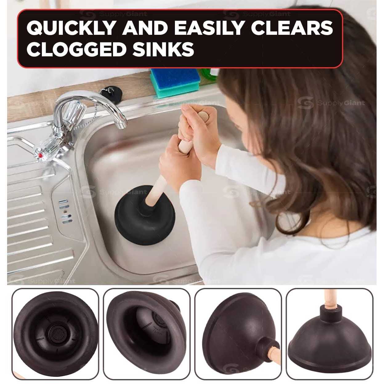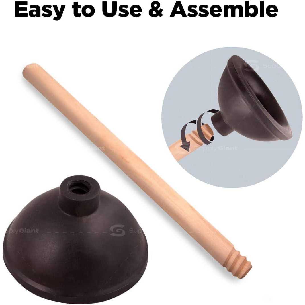 QUICKLY AND EASILY CLEARS CLOGGED DRAINS/TOILETS/ BATHS: Heavy duty quality will unclog drain in just a few pumps with minimal effort. TIGHT SEAL – Commercial quality double thrust durable rubber suction cup creates tight seal around the drain. EASY TO CLEAN: Just spray a bit of bleach, rinse with water, wipe off, and youre good to go. SIZE – 5-1/8” non-marking rubber forced cup, 18” wooden handle. POWERFUL PLUNGE – Heavy duty design for more powerful plunge. Clear clogs quickly and easily with this Supply Giant super durable plunger. Heavy duty quality will unclog blocked sink/basin/bath/ in just a few pumps. Manufactured out of the highest quality materials, designed for reliability and long last. Easy to clean and maintain, so you stay with no mess. Safe and easy to use.