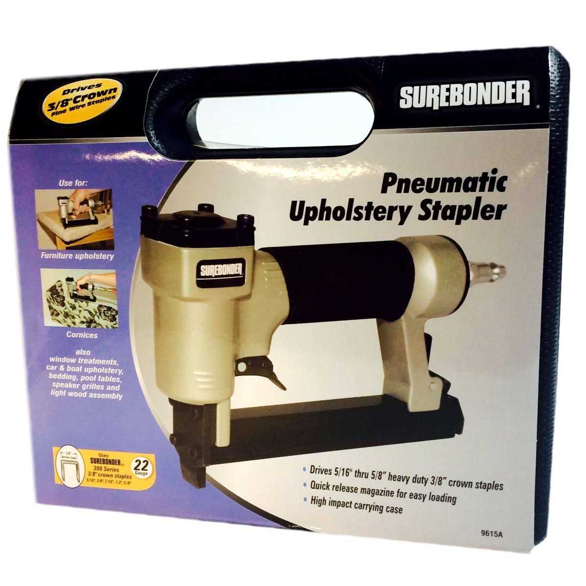 Surebonder 9615A, Upholstery Stapler with Carrying Case Description Product description The Surebonder 9615 Pneumatic Fine Wire Staple Gun is ideal for upholstery, insulation, roofing felt, house wrap and automotive vinyl. Drives 3/8″ Crown 22G fine wire staples. Pressure operation of 60 to 100 PSI with quick release magazine for easy loading and safety latch that won’t allow trigger to engage when latch is in the safety position. Magazine capacity holds 100 staples. Use Surebonder 300 series staples. Includes 1 Allen wrench, pneumatic oil and high impact carrying case. From the Manufacturer The Surebonder 9615 Pneumatic Fine Wire Staple Gun is ideal for upholstery, insulation, roofing felt, house wrap and automotive vinyl. Drives 3/8″ narrow crown 22G fine wire staples. Pressure operation of 60 to 100 PSI with quick release magazine for easy loading and safety latch that won’t allow trigger to engage when latch is in the safety position. Magazine capacity holds 100 staples. Use Surebonder 300 series staples.