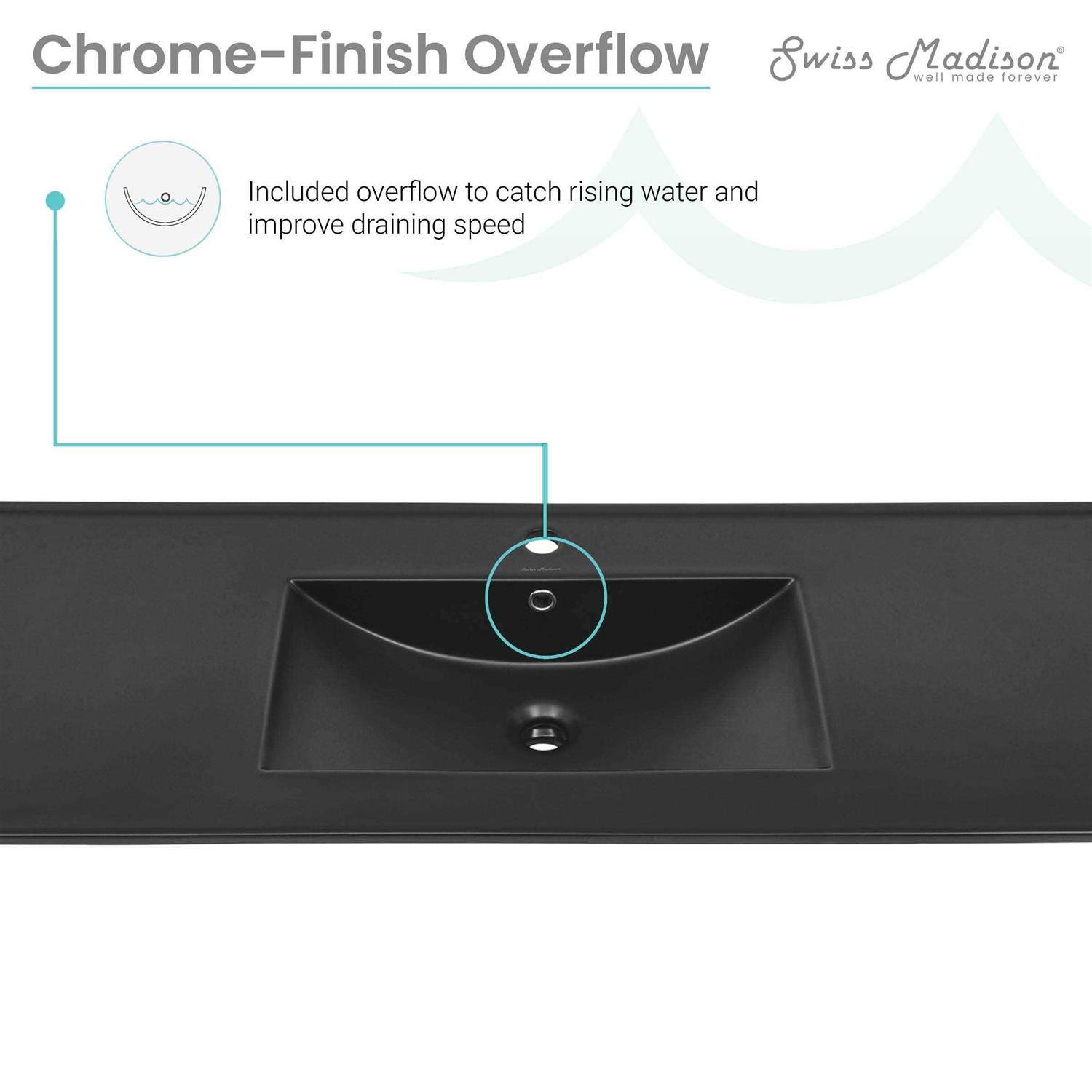 Swiss Madison Vanity Top Sinks combine ease of installation with a matte modern design into one single attractive package. The vanity top provides a smooth surface for everyday items before sloping gently into its spacious basin. A luxurious matte black finish protects the sink from scratches and stains.