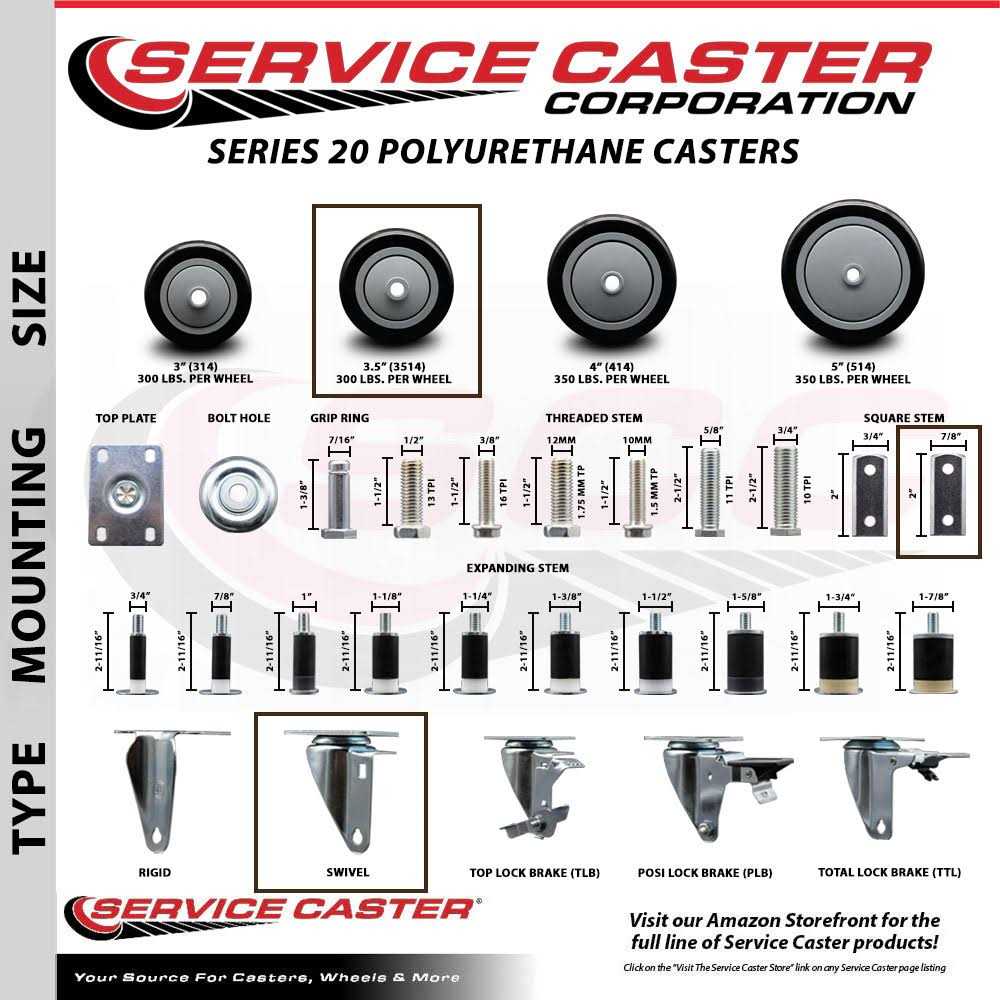 Listing is for four (4) Service Caster Series #20 swivel casters with a 3-1/2 diameter by 1-1/4 wide black polyurethane wheels and a 7/8 inch square stems. Supports a total weight of 1,000lbs (250lbs/per caster). The zinc plated finish provides durability under any condition, while the non-marking, non-marring polyurethane wheels perform especially well on hard surfaces such as concrete, tile, and wood. The square stems are designed to be bolted or riveted onto the inside of angled iron legs or against any flat surface. All rolling on a finely crafted ball bearing design that keeps you moving forward.