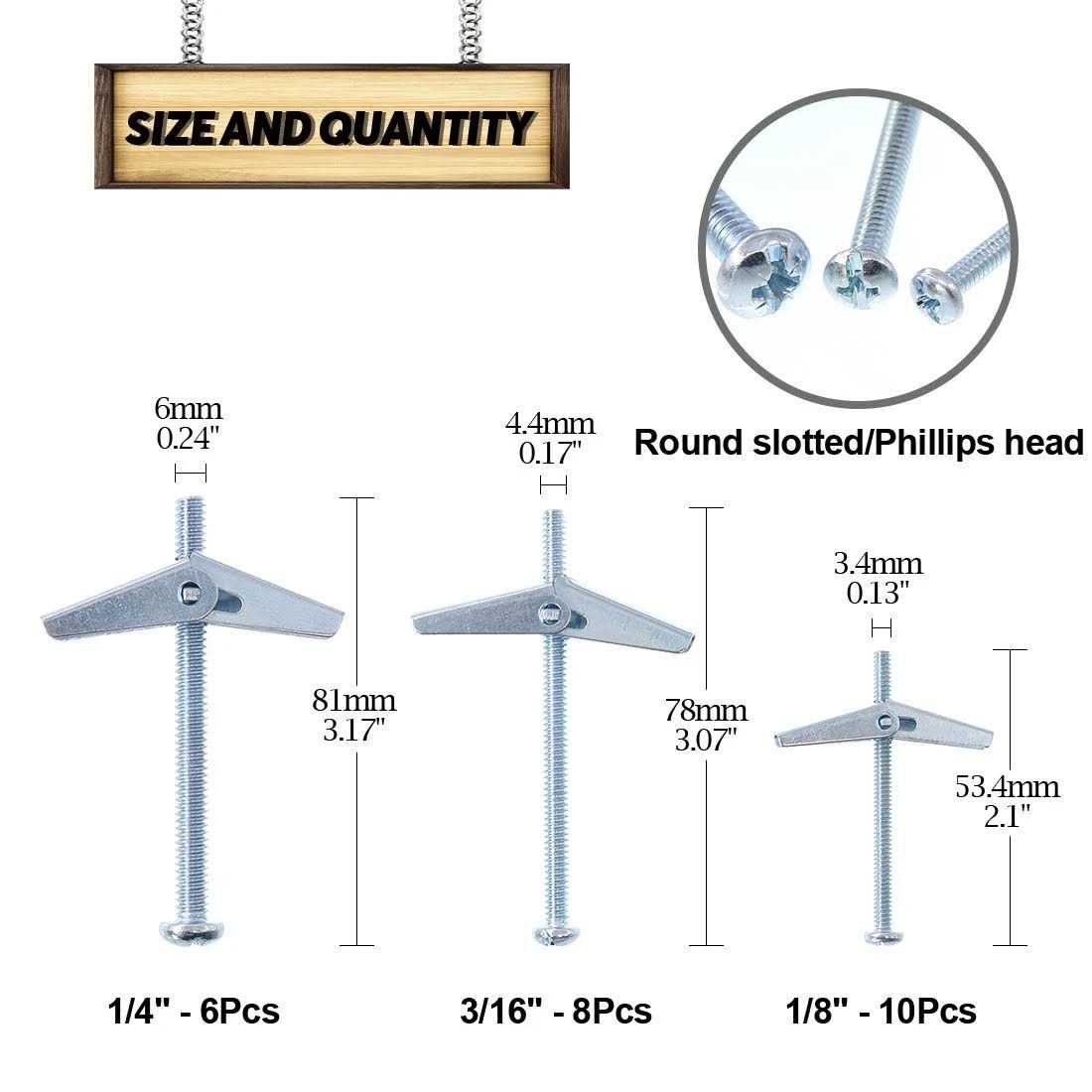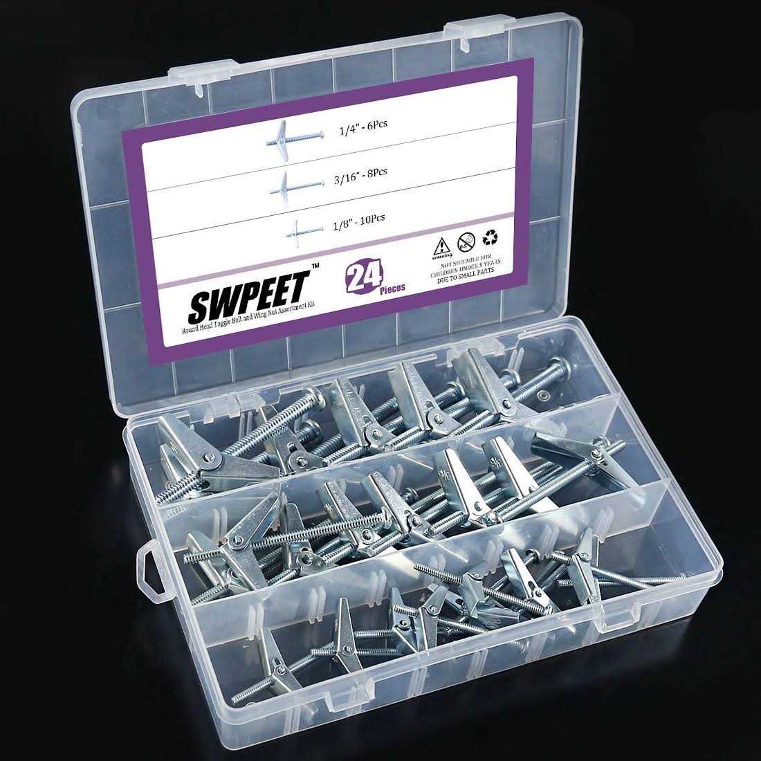 Swpeet Assorted 24 Pcs Toggle Bolt and Wing Nut Kit for Hanging Heavy Items on Drywall – 1/8 inch 3/16inch 1/4Inch