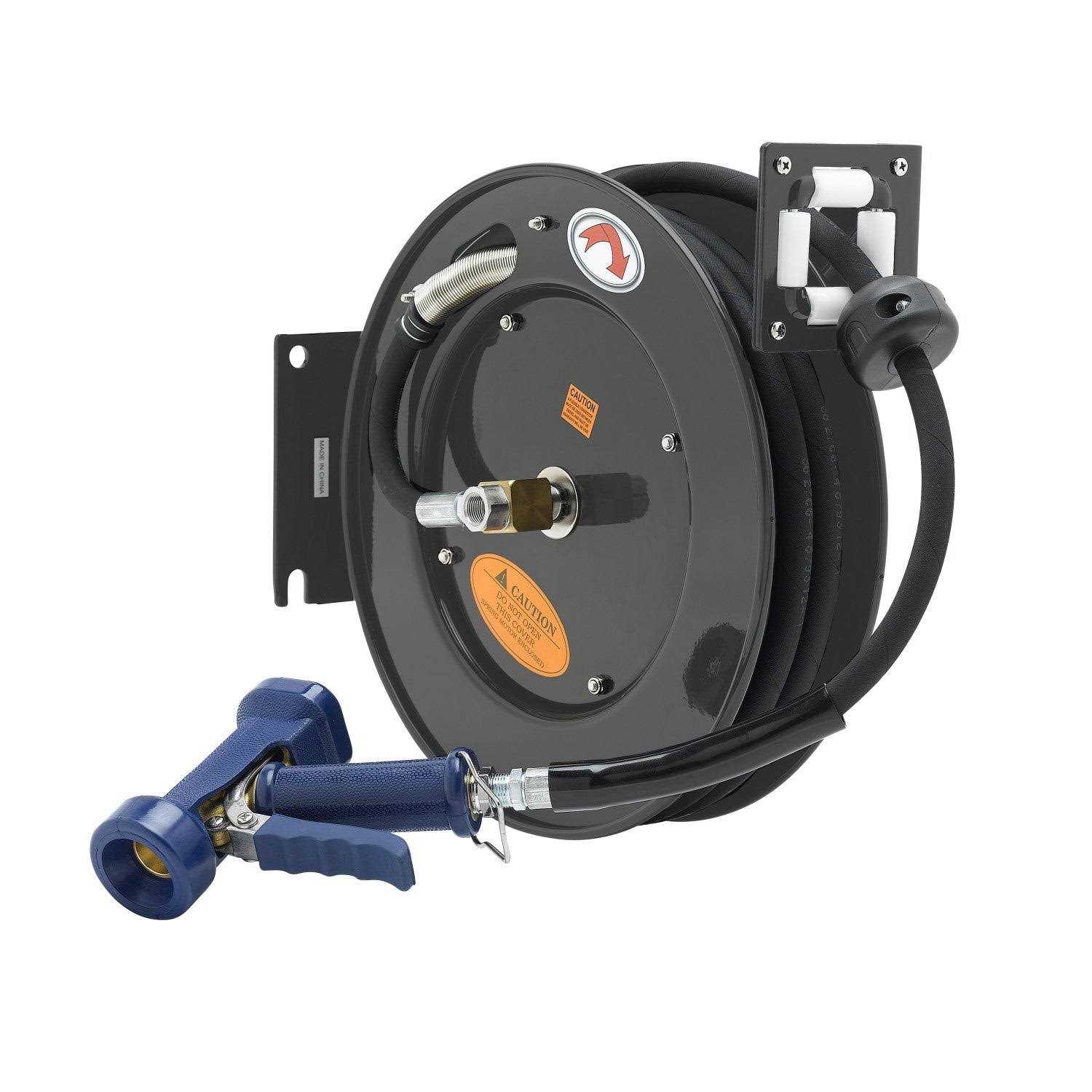 This Equip by T&S 5HR-222-12 hose reel includes a 25′ long heavy-duty hose with a 3/8″ diameter and a durable, black, powder-coated steel reel. This model comes fully equipped for use in your kitchen with a front trigger water spray gun. A ratcheting system holds the hose in place, allowing you to extend the length of hose needed for your application. When you are finished, a simple tug on the hose will cause it to automatically retract. The hose bumper can be adjusted so that your hose will only retract as far as you desire. The base is built to allow for simple mounting on a wall, ceiling, or under a counter for quick and convenient access in commercial kitchens and janitorial locations. With this versatile base, you can install the hose precisely where you need it.