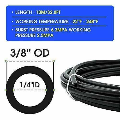 Nylon Tubes have a rigid that is not easy to burst and no leaks. TRANSPORT A VARIETY OF MEDIA? Such as air, water, oil, chemical solvents.? MULTI-PURPOSE? Nylon Tubes are ideal for general use such as air hose for fish tanks and aquarium, aquaponics, hydroponic, ponds, indoor water garden, drip irrigation, drain, water line, pumps, vacuum, siphon, filters, air conditioning, humidifiers, other home uses, props, plumbing, refrigeration, industrial, laboratory applications for transferring liquid and gas. TUBE FITTINGS? 3/8 od x 3/8 odtwo way) ASIN:###3/8 od x 1/4 npt ASIN:### Features: Model? Black Nylon Tube Size? 9.525mm) 1/4”ID? 6.35mm) Pressure? Burst Pressure 913Psi;Working Pressure 362Psi. Working Temperature:?-22F – 248F Length?