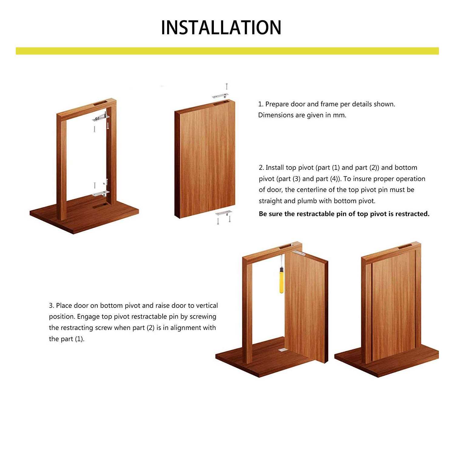 - Enables a doorway that pivots from a point on the floor under the door’s center instead of from hinges on the side of a door frame.