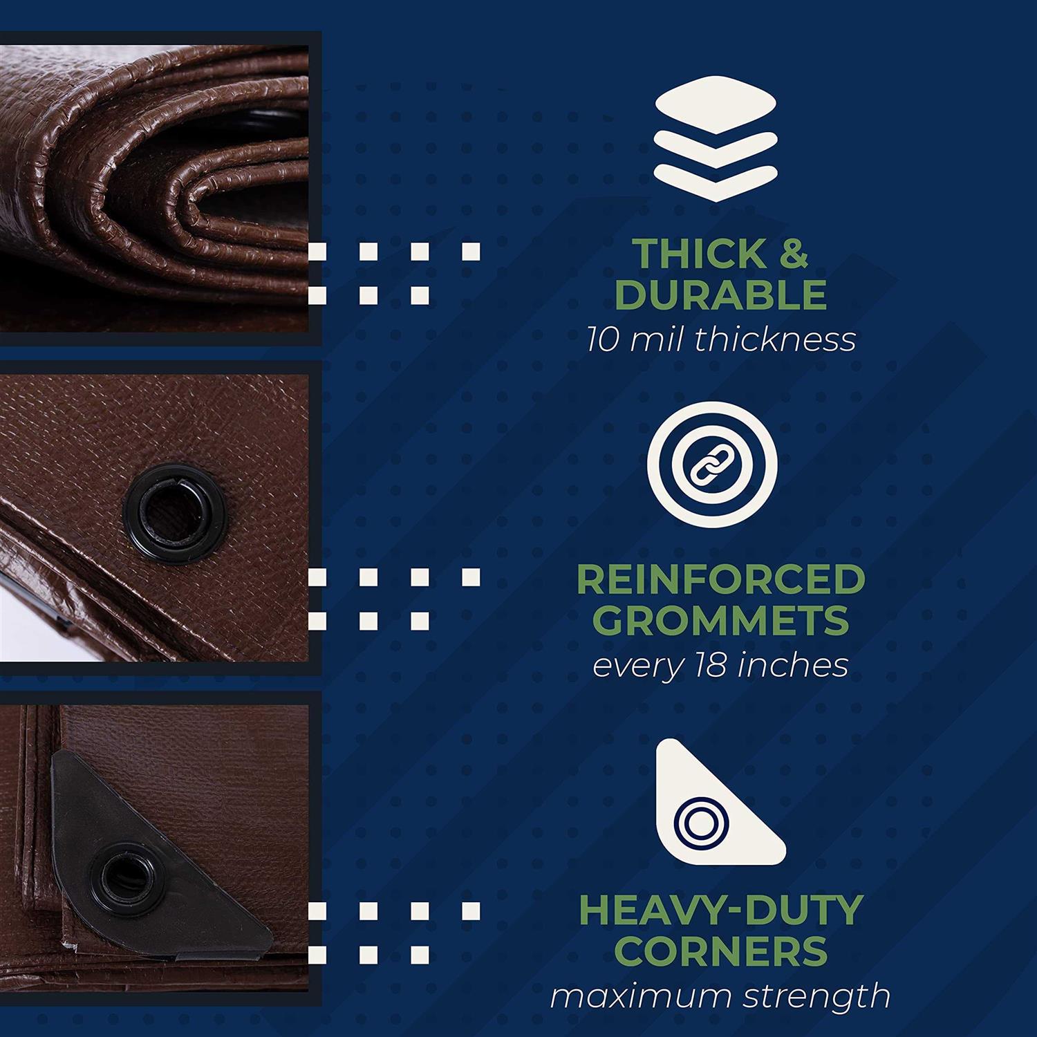- ✅ : Our brown weatherproof tarps is also tear proof. The thickness of it makes it a heavy duty outdoor tarp made to last the toughest environments.