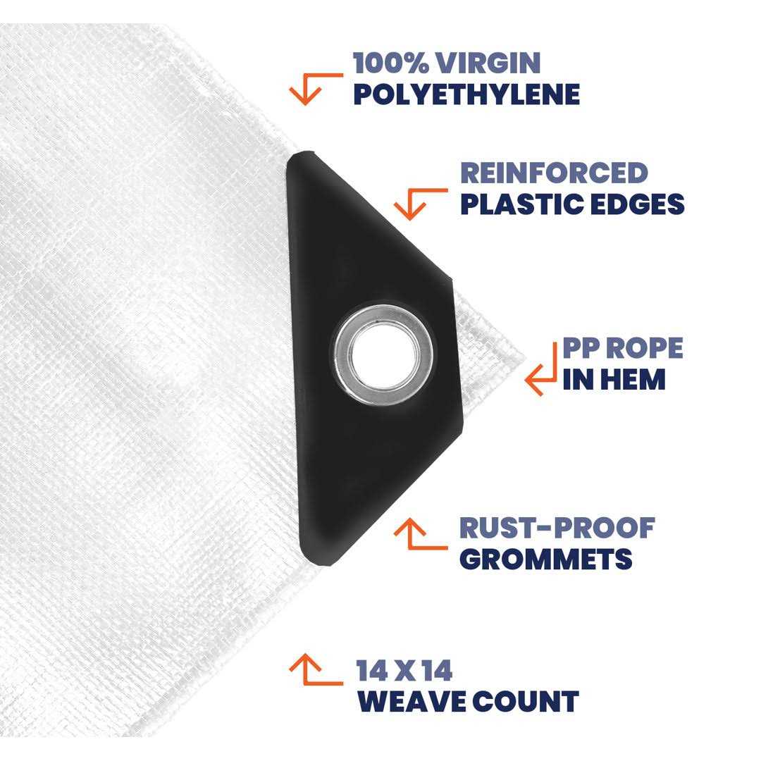 This multi-purpose tarp serves as a protective cover for items such as building materials, vehicles, roofs, and outdoor furniture. It boasts metal grommets every 24″ and it has reinforced edges, making it quick and easy to tie down. Thanks to the ultra-strong grommets, your tarp will remain securely in place even when it is windy. This durable tarp is constructed of extra heavy-duty, 100% virgin polyethylene with a 14 x 14 weave count. This thick, rugged material will not rip or tear to withstand extreme outdoor conditions. It is waterproof to keep items dry and to prevent them from being buried beneath snow. This tarp is also UV-resistant to protect objects from the sun. Durable and reliable, this heavy-duty tarp provides a high level of protection against harsh outdoor elements.