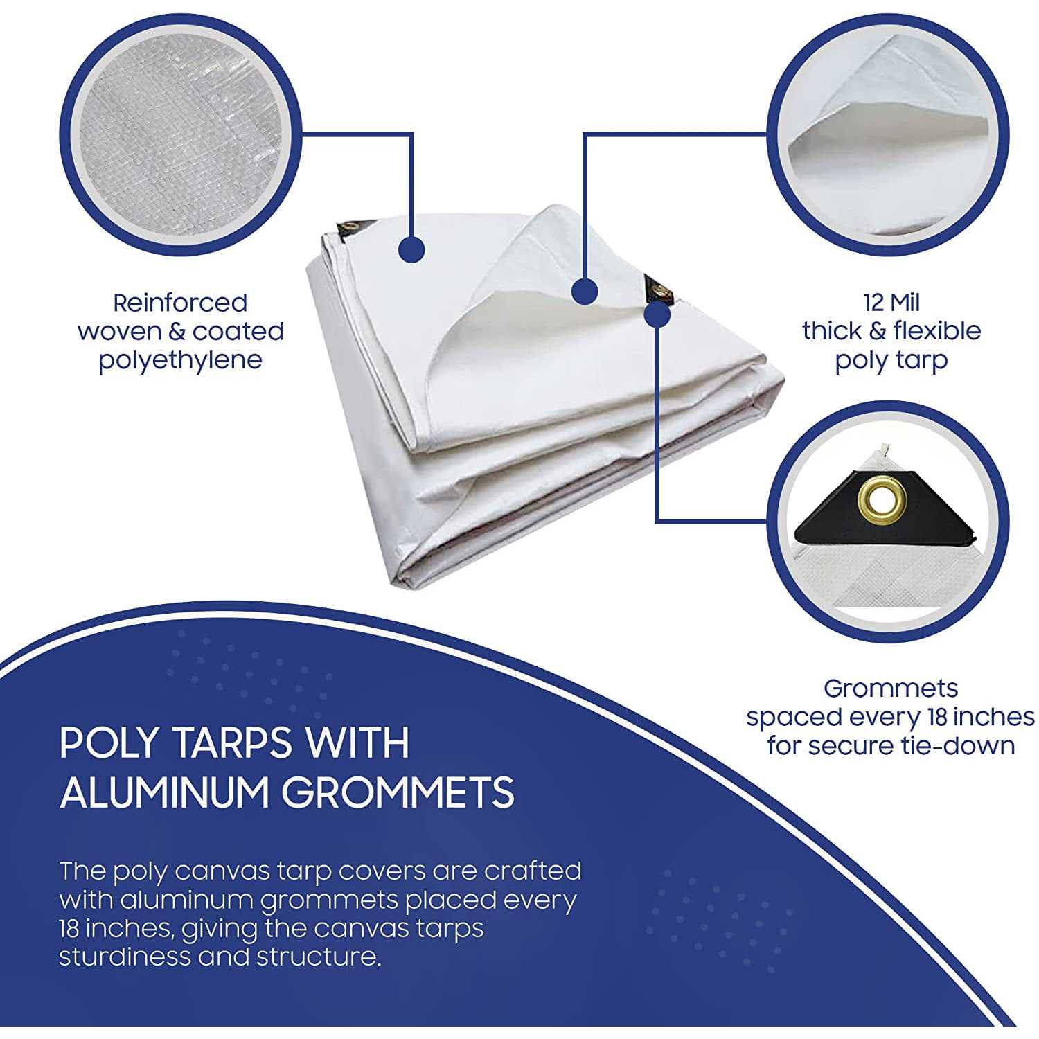 Tarps Now offers industrial-grade Poly Tarps. This tarpaulin is resistant to tearing, UV, mildew, acid, rot, and more. The mesh count is 12 x 14 per sq inch. The weight is 6 oz per square yard with a thickness of 12 Mil. Our Tarps are 100% waterproof, incredibly durable, and flexible. HEAVY-DUTY POLY TARPS: Our Poly Tarp is constructed of 3 Ply material and both sides are coated with a solid polyethylene HEM REINFORCED WOVEN: Hems are reinforced woven with rope and coated polyethylene finish. PERFECT FOR ALL WEATHER: Can withstand tough weather conditions even under harsh arctic temperatures. MEASUREMENTS: The size is 16′ x 24′ (Actual Size 15′-6 inch x 23′-6 inch). The color is White on both sides. RUSTPROOF EYELET: These tarp covers are crafted with #2 aluminum grommets and spaced approx every 18 inch. Tarps Now waterproof Poly Tarps are perfect for camping, covering vehicles like cars, trucks, boats, furniture, etc. Please Note: This tarp is cut size, finish 6 inch-8 inch smaller than the full size.