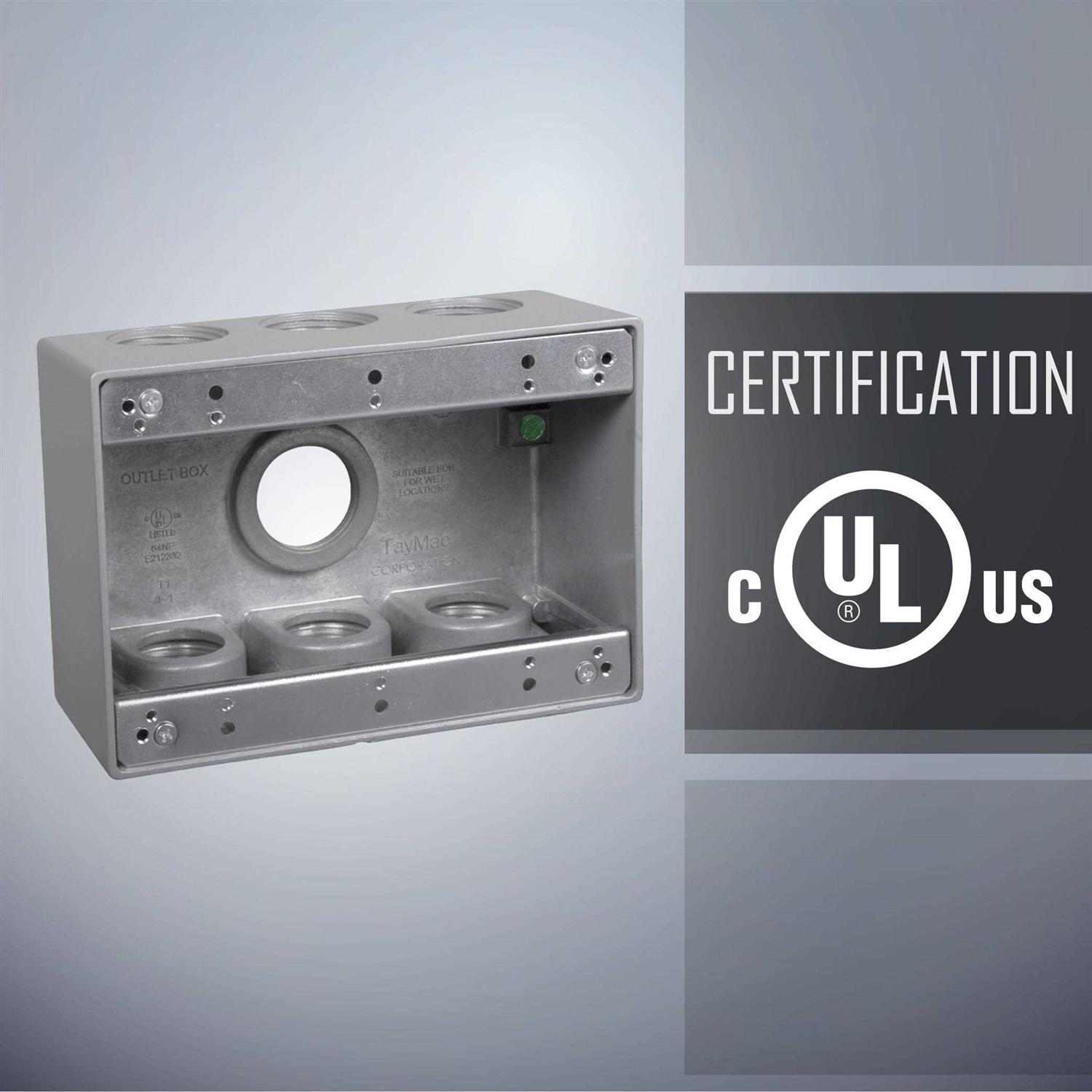 TB Series 3-Gang outlet boxes are made of commercial quality die-cast metal construction with a premium powder coat finish. The TB Series of outlet boxes are available in seven 1/2 in. or one 1 in. hole configurations. The outlet boxes are UL Listed and NEC Compliant.