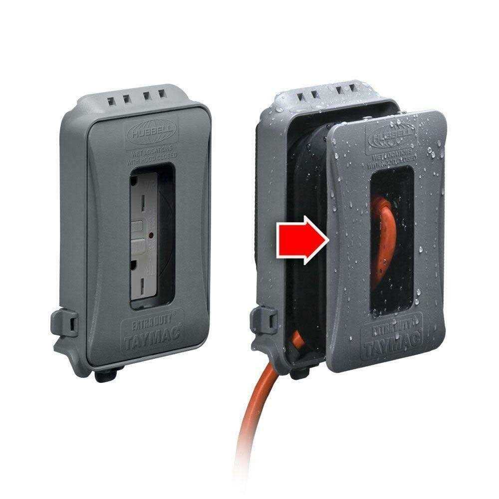 TayMac weatherproof expandable non-metallic while-in-use device covers provide weatherproof protection when an outlet is in use. The covers provide in-use flexibility by expanding outwards from 1 in. to 3 in. Expandable while-in-use covers are made from ultra-rugged polycarbonate and synthetic neoprene rubber. An attached gasket, mounting hardware and installation instructions are included.