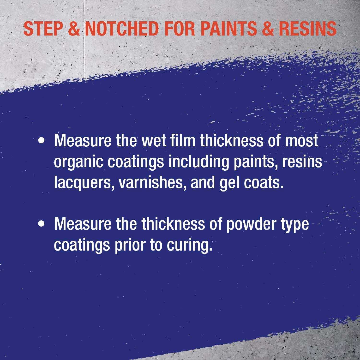 Features:Wet Film Thickness Gauges are designed to quickly and easily measure the thickness of coatings immediately after they have been applied to a substrate – These gauges are also commonly known as: Combs, MIL Gauges, Step Gauges and Notched Gauges – The gauges incorporate a series of notches cut into their sides much like the teeth on a comb – The wet film thickness of most organic coatings including paints, resins, lacquers, varnishes, gel coat, etc. may be measured – The thickness of powder type coatings may also be measured before curing