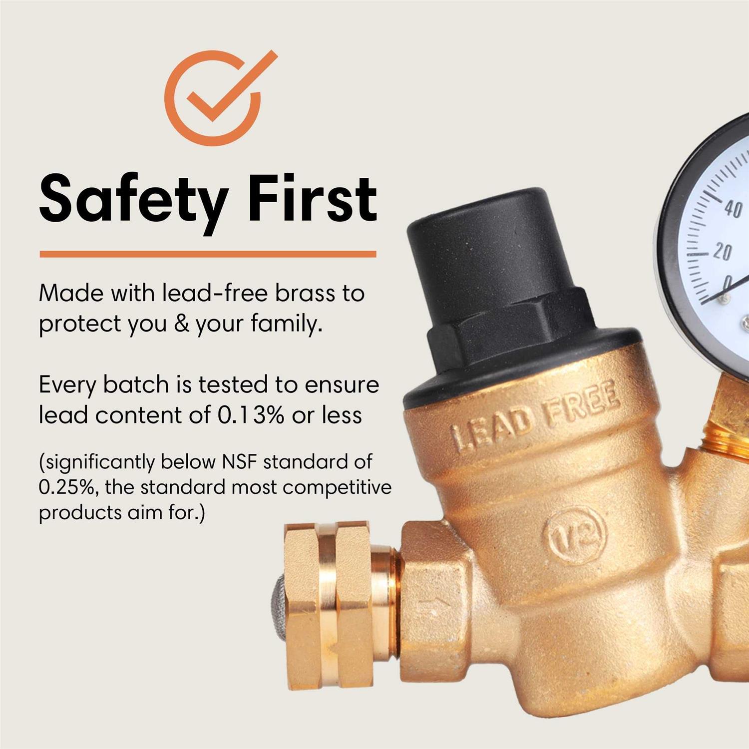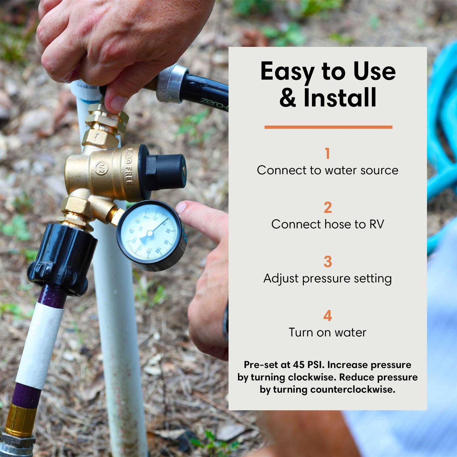 Easy installation, universal compatibility, impressive quality. The TechnoRV water pressure regulator is a must-have to keep your water at safe pressure while you’re on the road. Give yourself the peace of mind of safe water pressure for you and your family. Installation is as easy as attaching a water hose. Provides strong shower water pressure and good overall water flow. Compatible with all U.S. water sources, including ¾” garden hoses and NH threads. Preset at 45 PSI and is adjustable to reach up to 160 PSI. Keep your family safe with the lowest amount of lead of any regulator currently on the market. Every batch of regulators is tested to ensure it contains less than .13% lead – well under NSF lead requirements of .25%.