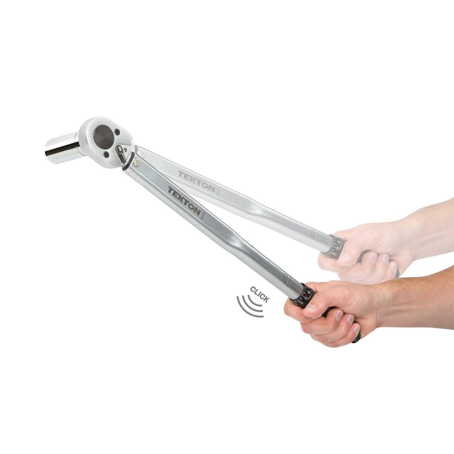 Calibrated to an accuracy of +/- 4%, the TEKTON 1/2 in. Drive Click Torque Wrench lets you work with confidence, eliminating guessing and the common tendency to overtighten fasteners. Correctly tightening fasteners to a vehicle or equipment manufacturer’s torque specifications ensures parts are properly secured without being damaged. Simple and easy to use, this wrench has a reversible ratcheting head that drives fasteners in both directions and measures torque in the clockwise direction. To measure torque, set the desired value on the handle scale (foot pounds or Newton meters) and begin tightening the fastener. When the preset torque value is reached, a reliable mechanical operation inside the handle produces a click you can hear and feel, alerting you to stop applying force. Built for consistent performance and years of dependable service, the mechanical design doesn’t need batteries, and the all-steel construction has no plastic parts to break or wear out. IMPORTANT: This wrench is shipped pre-calibrated and ready to use. To help maintain calibration, store at its lowest setting of 10 ft.-lb. /13.6 Nm when not in use. Be sure to read and understand the operator’s manual, including all safety information, before first use.