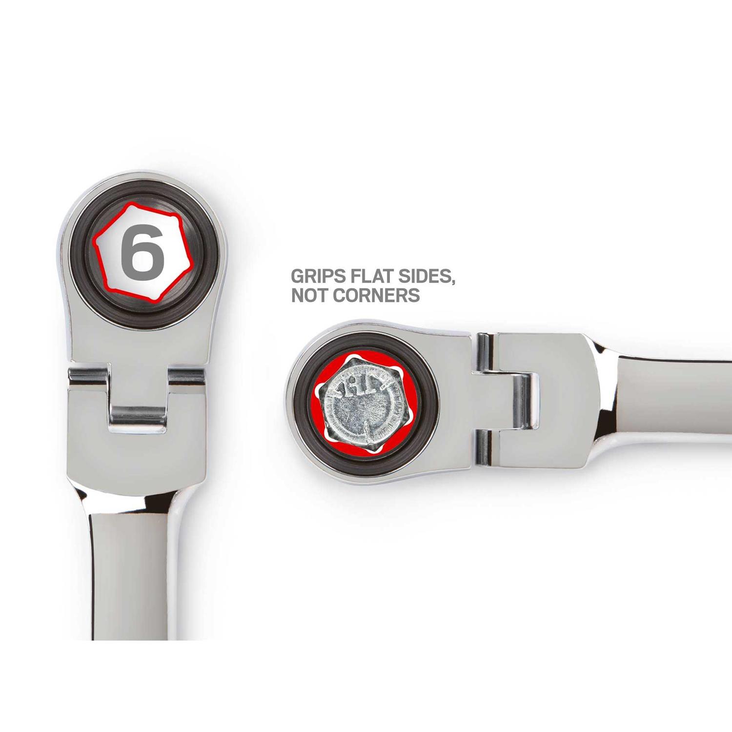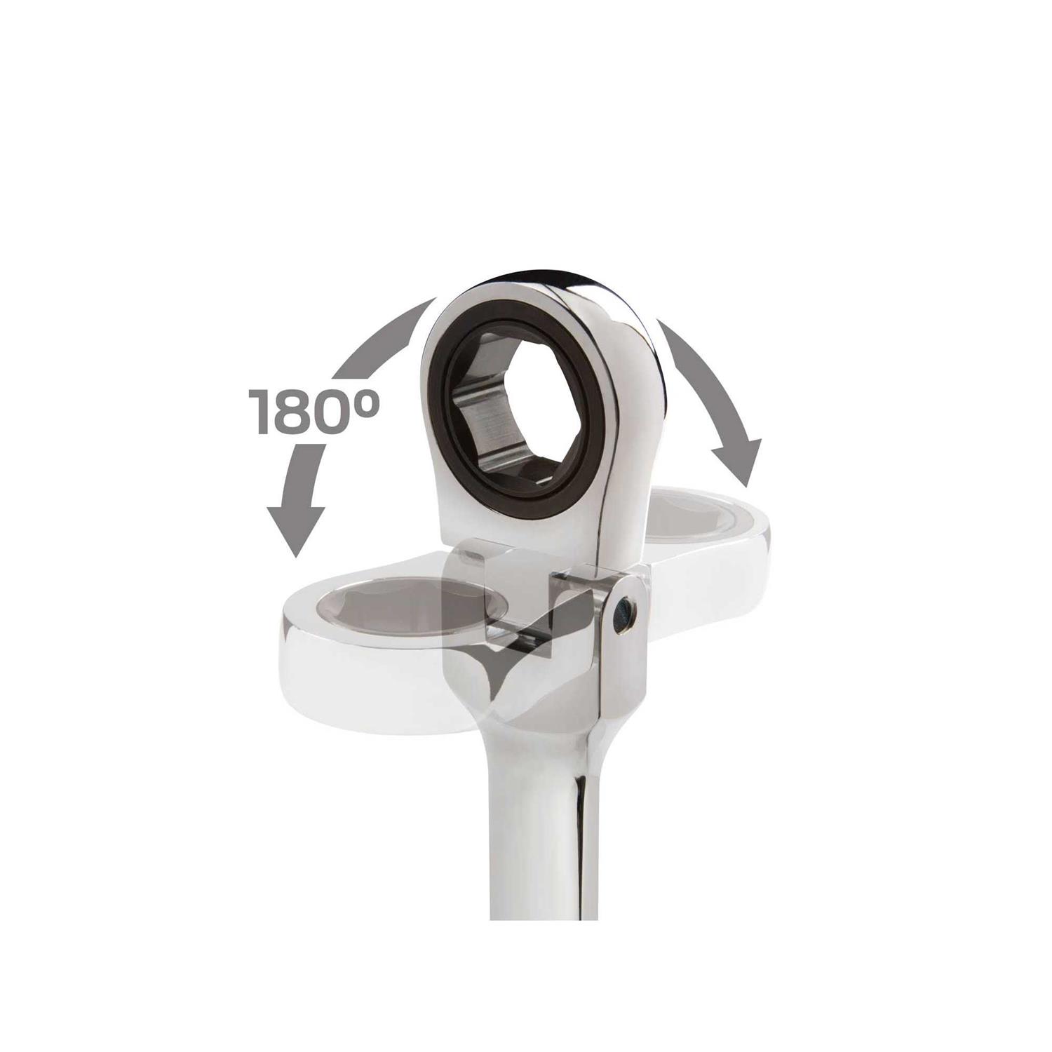 Giving you ultimate access and muscle, an extra long beam reaches deep into narrow spots and provides the leverage to turn tough fasteners. Smoothly pivoting through 180, the heads hold any angle to slide onto fasteners. They are free to move with each stroke, allowing the wrench to navigate around obstructions along the swing path. The 6-point openings provide a sure, snug fit on hex-shaped fasteners so you can apply maximum torque without slipping off, saving aggravation and your knuckles. To prevent round-off, the openings contact and apply force to the flat sides of fastener heads rather than the corners. Equipped with 72-tooth ratchet gears that need just 5 of swing arc to reach the next tooth position, it is fast and efficient when there is not much room to move.