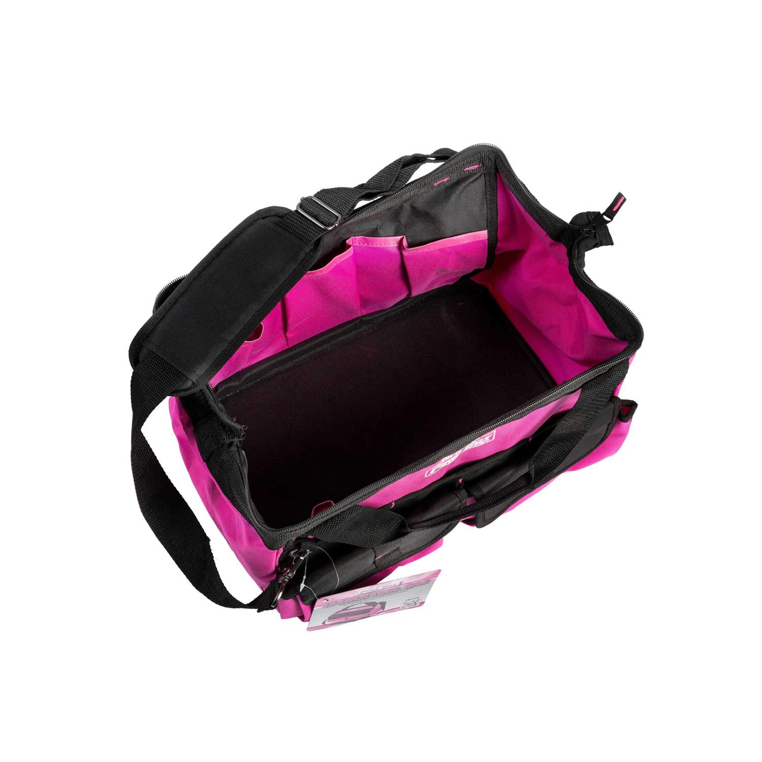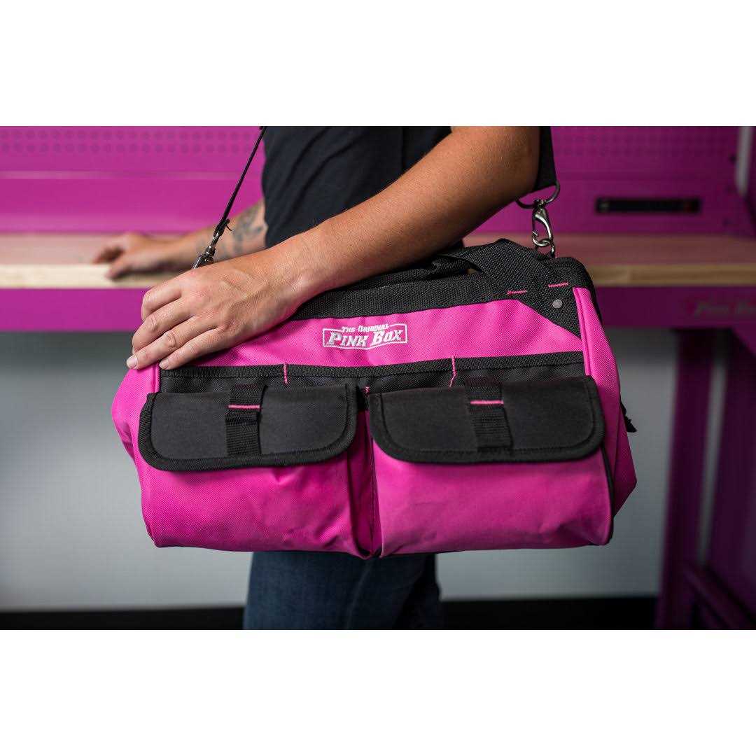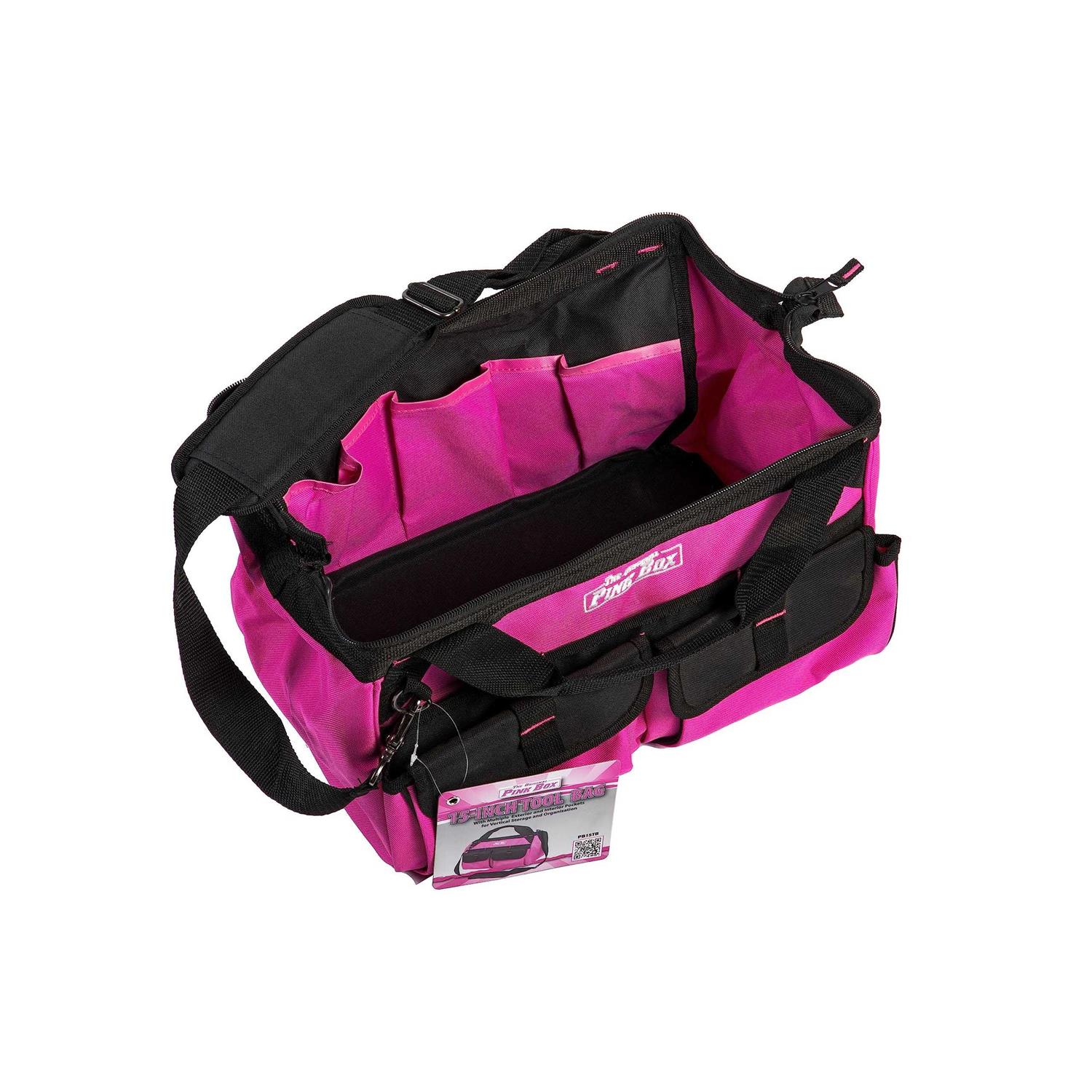 This versatile 15 canvas tool bag by The Original Pink Box has 24 total inside and outside pockets, plus a large interior for convenient on-the-go storage and organization. Polyester canvas is durable but lightweight enough that it wont weigh you down. The 14 pockets on the outside are various sized, including two that fasten shut for extra protection of your goods. The 10 interior pockets give even more organization options. The wide mouth opening stays in place while in use and the heavy duty zipper ensures it stays shut while on the move. The base of this tool bag is reinforced to keep its shape while rubber feet help protect it from wear and tear. Take this bag effortlessly anywhere using the web carry handles or the adjustable padded shoulder strap.