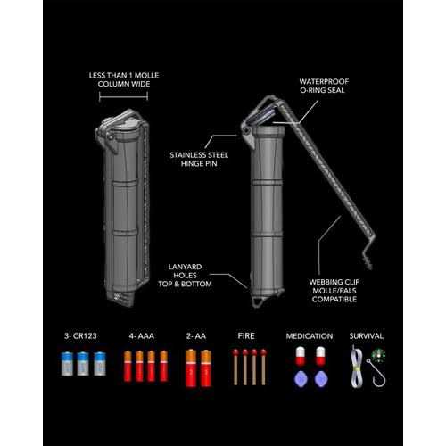 - Can store: 3 CR123, 4 AAA, or 2 AA batteries; survival and first aid gear; consumables; money & flash drive.