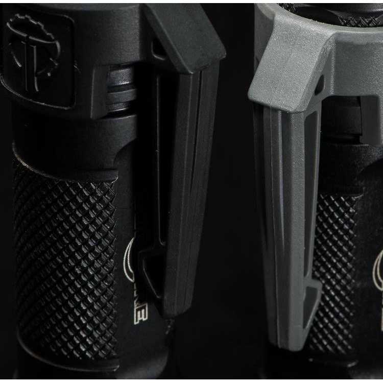 The Thrym SwitchBack 2.0 Large Flashlight Ring is a multi-functional finger ring and pocket clip for your tactical flashlight. It provides a more secure way to carry your firearm and flashlight regardless of impact, moisture and heat/cold changes. To mount the ring, attach it between the tail cap and body of the flashlight for a repeatable grip index during deployment from pocket to pouch. The SwitchBack can also be used with handguns or long guns and allows you to shoot with a two-handed grip, employ traditional low-light techniques and positively retain the tac light when drawing, reloading and addressing malfunction. Deploy and index a flashlight from both pockets and pouches, using the SwitchBack’s rigid, but releasable retention ring Shoot using a natural two-handed grip (the SwitchBack Technique) Employ all traditional low-light techniques Positively retain the light when drawing a firearm, reloading and addressing a malfunction Finger ring releases under heavy force/torque, but can reset Pocket clip works with MOLLE/PALS webbing Pocket clip position allows for a slightly deeper carry than the SwitchBack Large (original) Tubular portion is cut lower to allow grip on both sides of the tail-cap during installation Wide thumb rest with traction features Small crush ribs on the SwitchBack 2.0’s lip that create a custom fit across a broad range of lights Aluminum spacer that expands compatibility to Streamlight HL and HL-X flashlights and other manufacturers with similar designs Designed in manufactured in the USA.