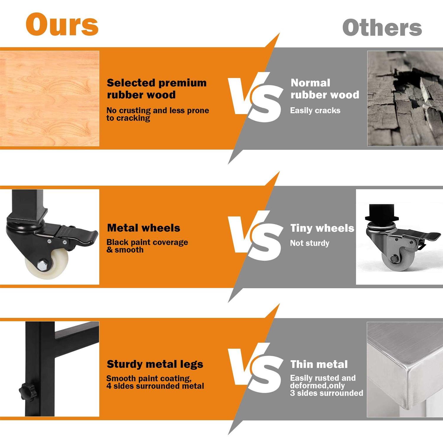 Made of oak and steel, our 60 inch working table with outstanding stability and durability ensures high weight capacity, which can hold up to 2000 lbs. In addition, it has 3-level adjustable heights from 25.6 inch to 39.4 inch. In this way, users can set an ideal height for any project according to their requirements. Specifically speaking, it is a working table for garages, commercial shops, automotive repair shops, office buildings and families.