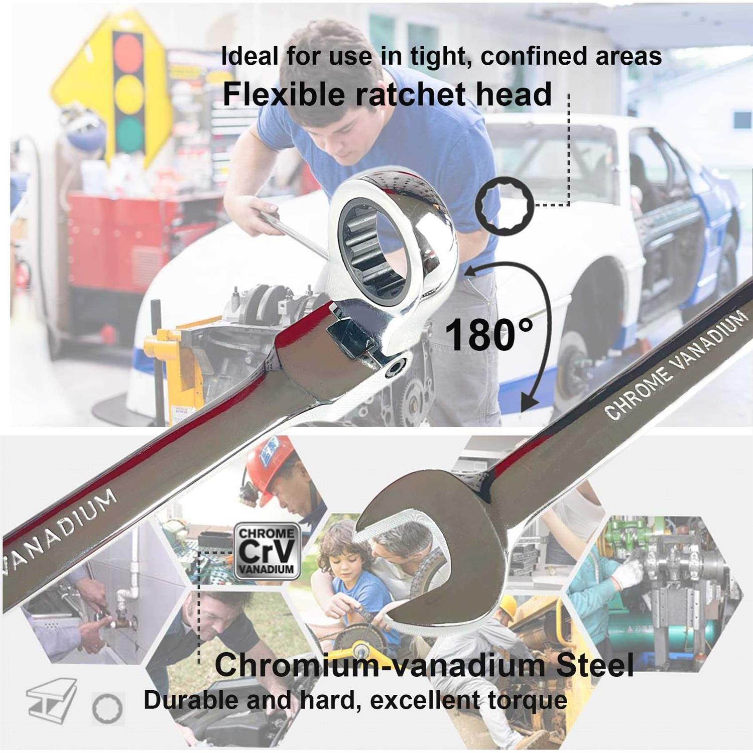 Brand: TR TOOLROCKFeatures: 【Premium Material】The ratcheting wrenches are made of chrome vanadium steel with corrosion-resistant mirror chrome finish for durability.【 180°Flex-head】Box end heads pivot 180 degrees to easily get around obstructions. snugly fit hex-shaped fastener heads and resist slipping off while you work.【 High-efficiency】The 72 teeth ratchet gear needs a minimum of 5 degree swing arc that is perfect for professional mechanics. The best choice for working in tight spaces.【12pcs Metric Size】The metric ratcheting wrench set includes 8mm, 9mm,10mm,11mm,12mm,13mm,14mm,15mm,16mm,17mm,18mm and 19mm.【 Oxford cloth bag】Come with a organizer bag.